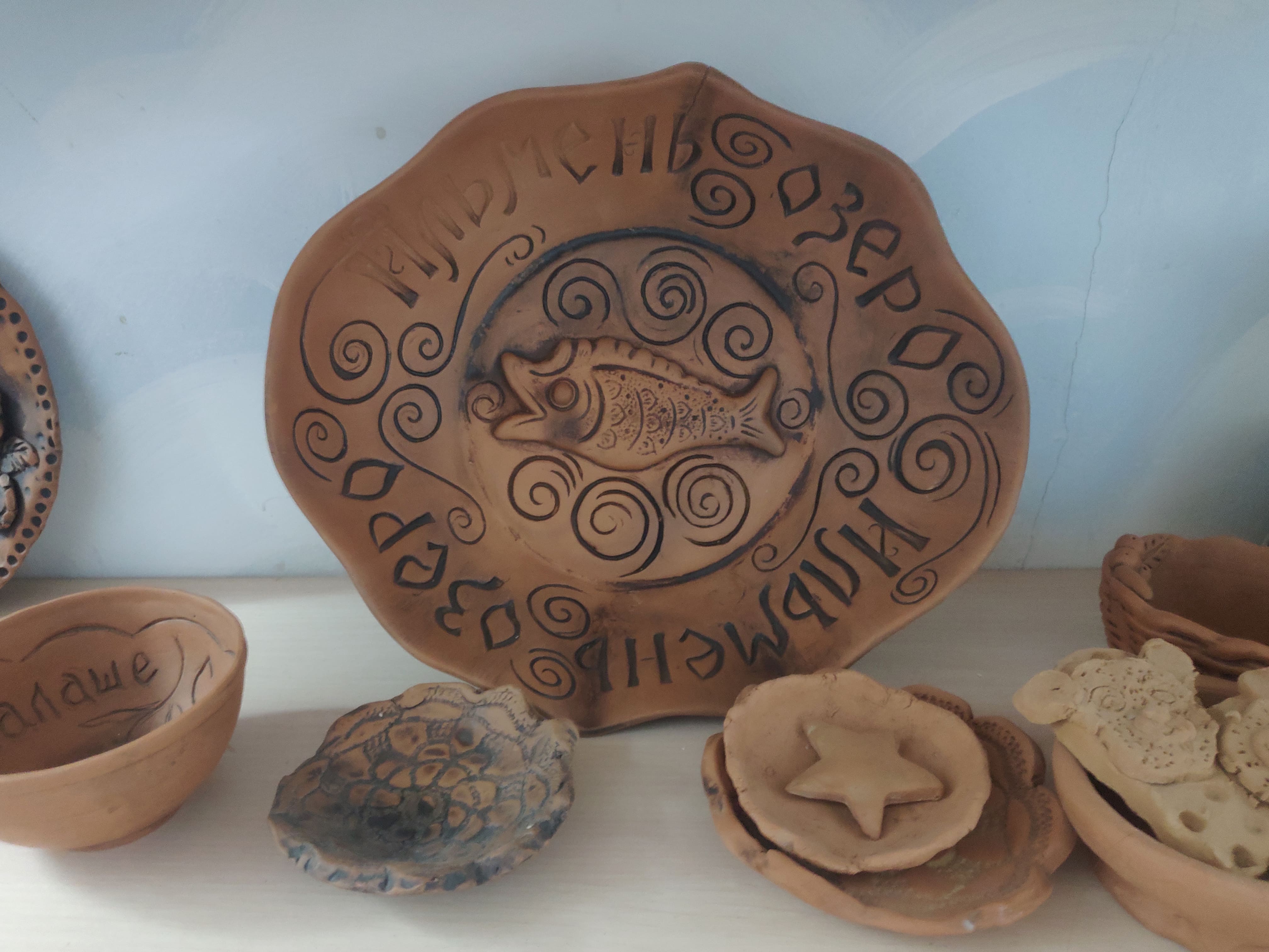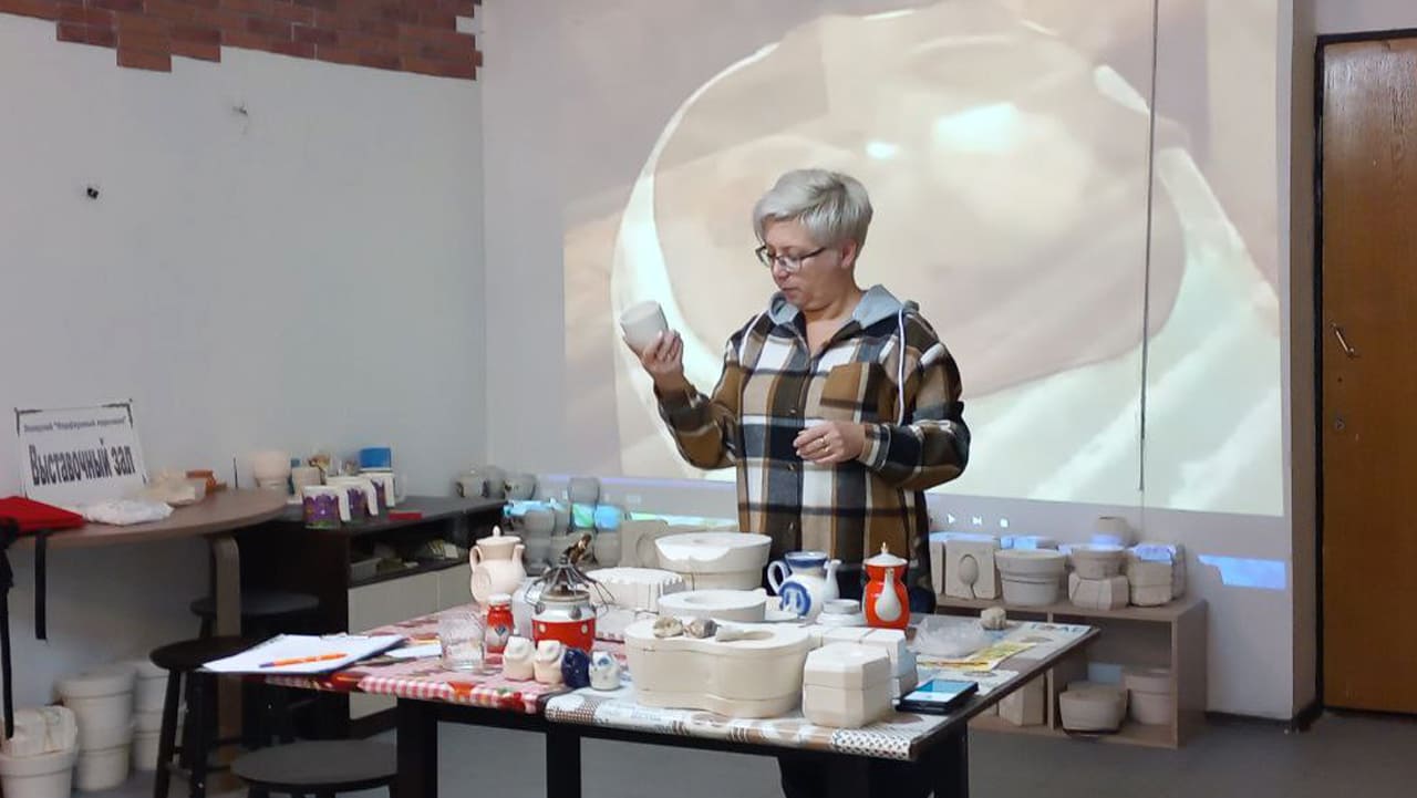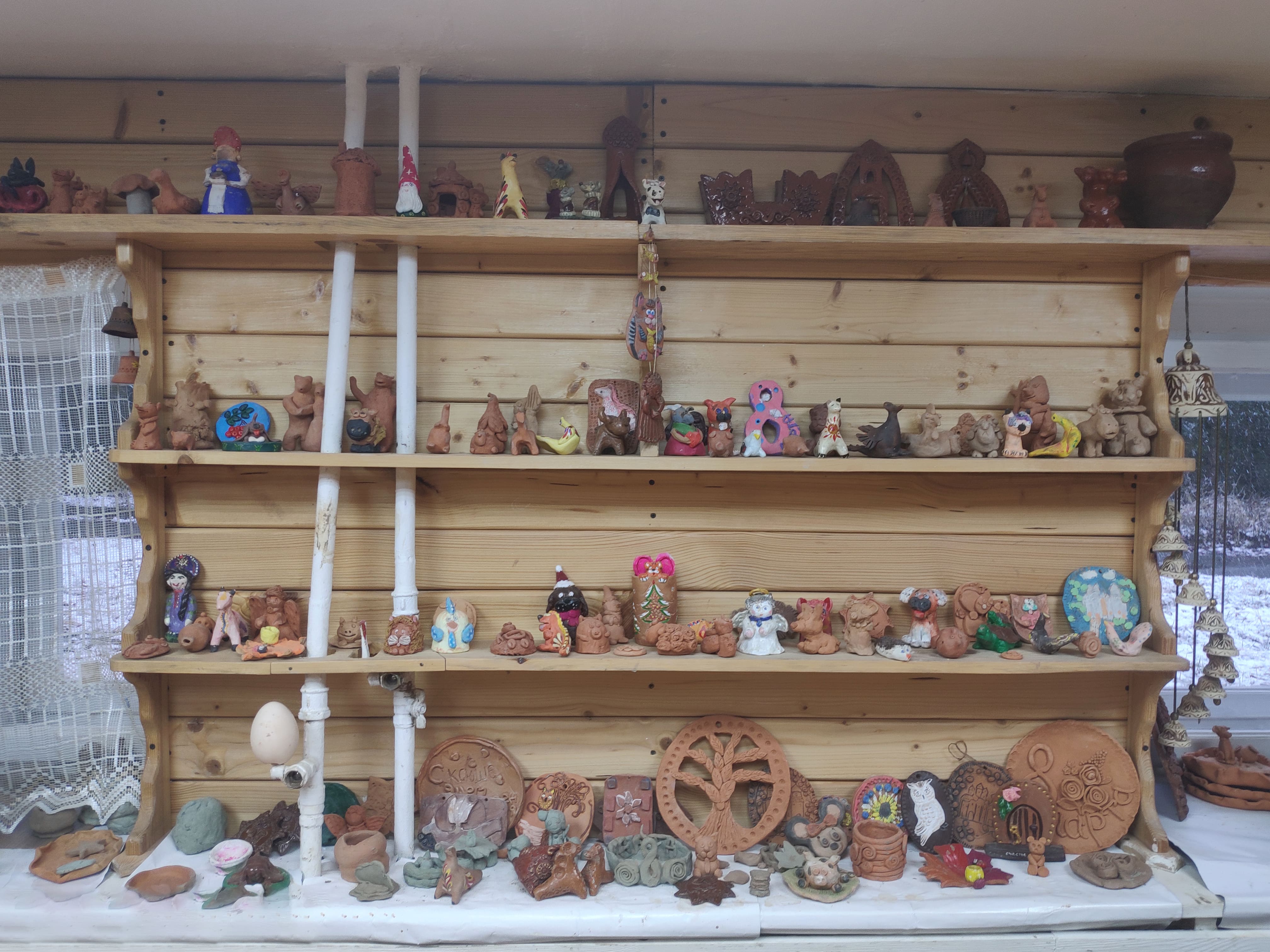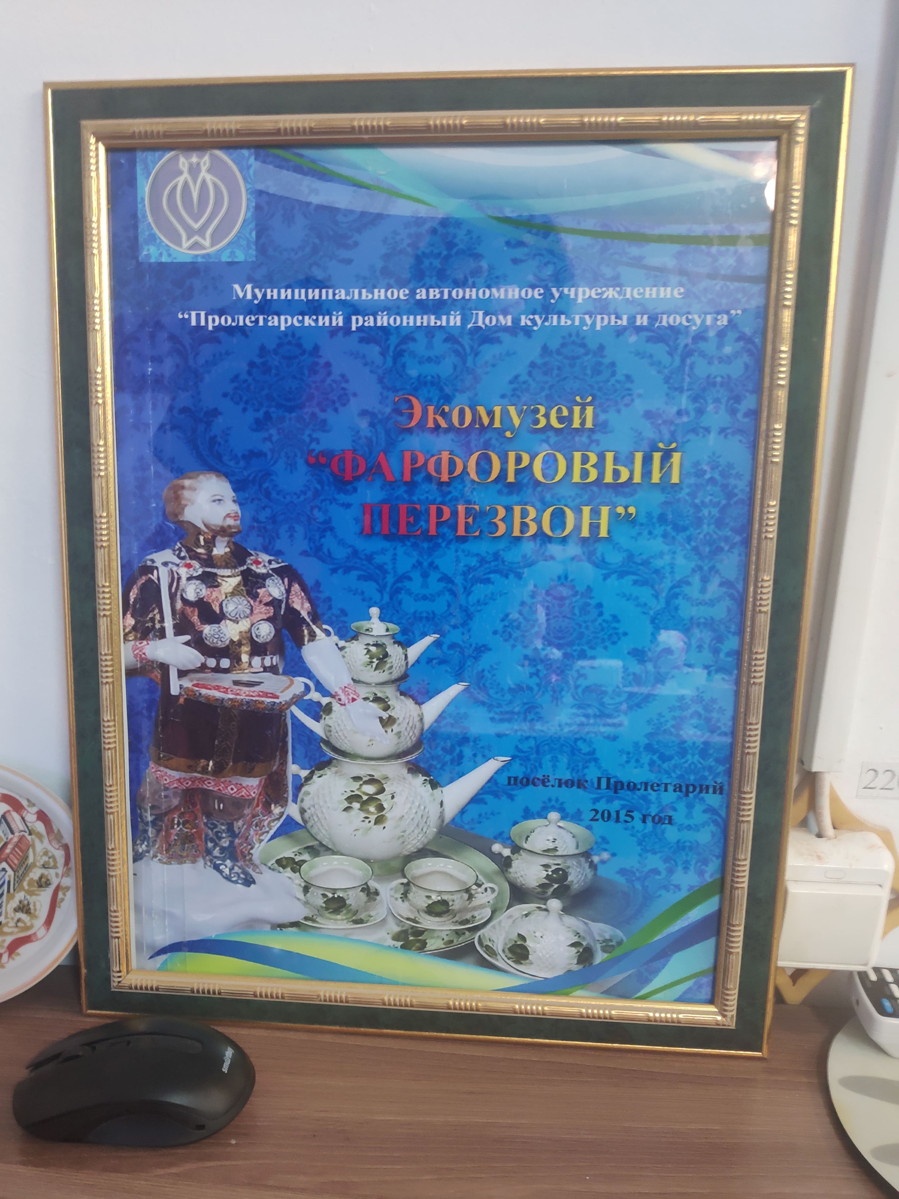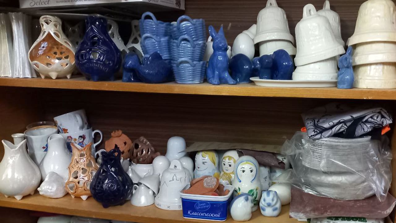 Пролетарский районный Дом культуры, на базе которого создан музей: живописный холл, детские мастерские, формы для обжига, готовые изделия и сувенирная продукция. Дата съемки: осень 2022 года.
