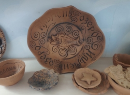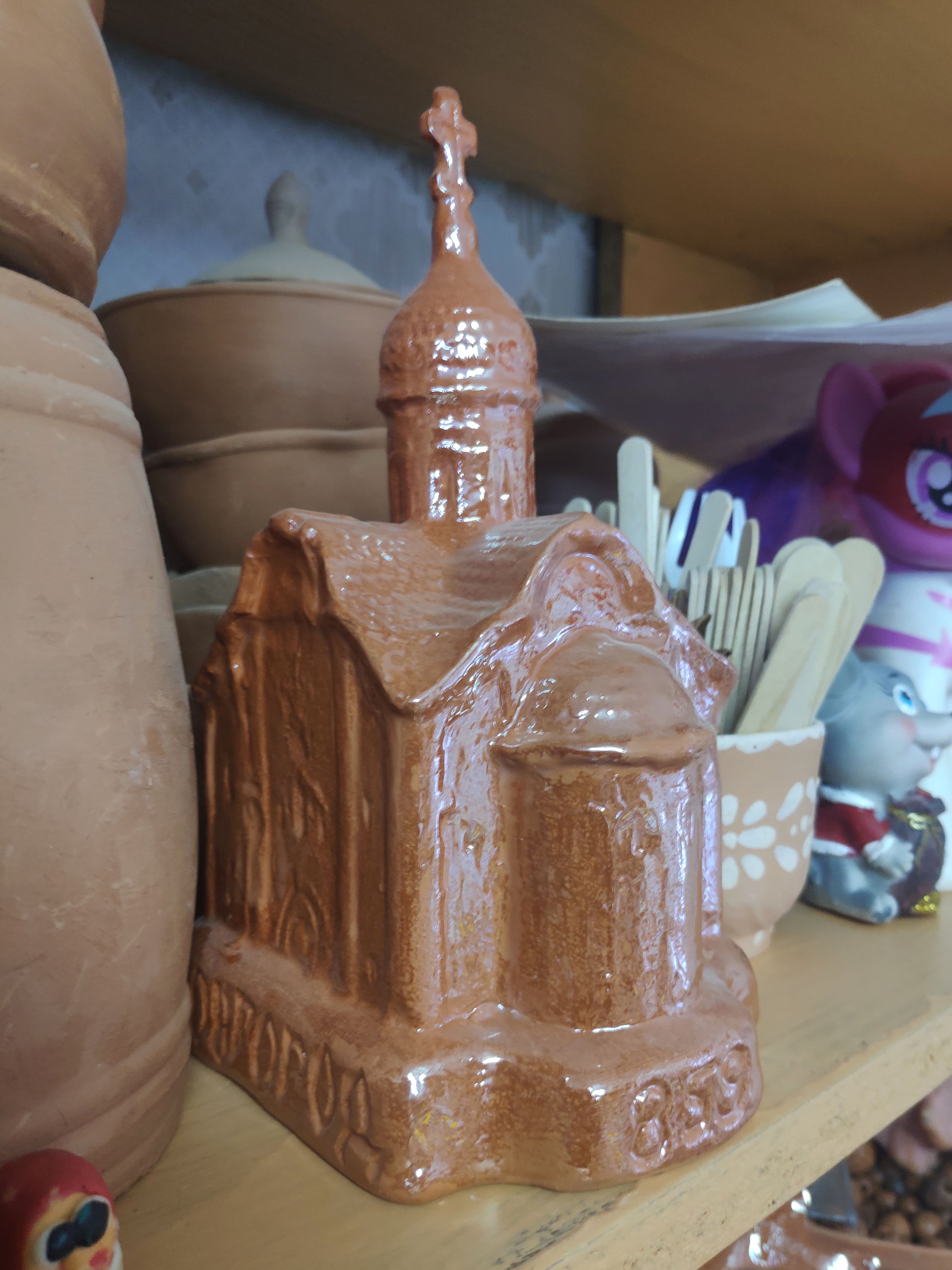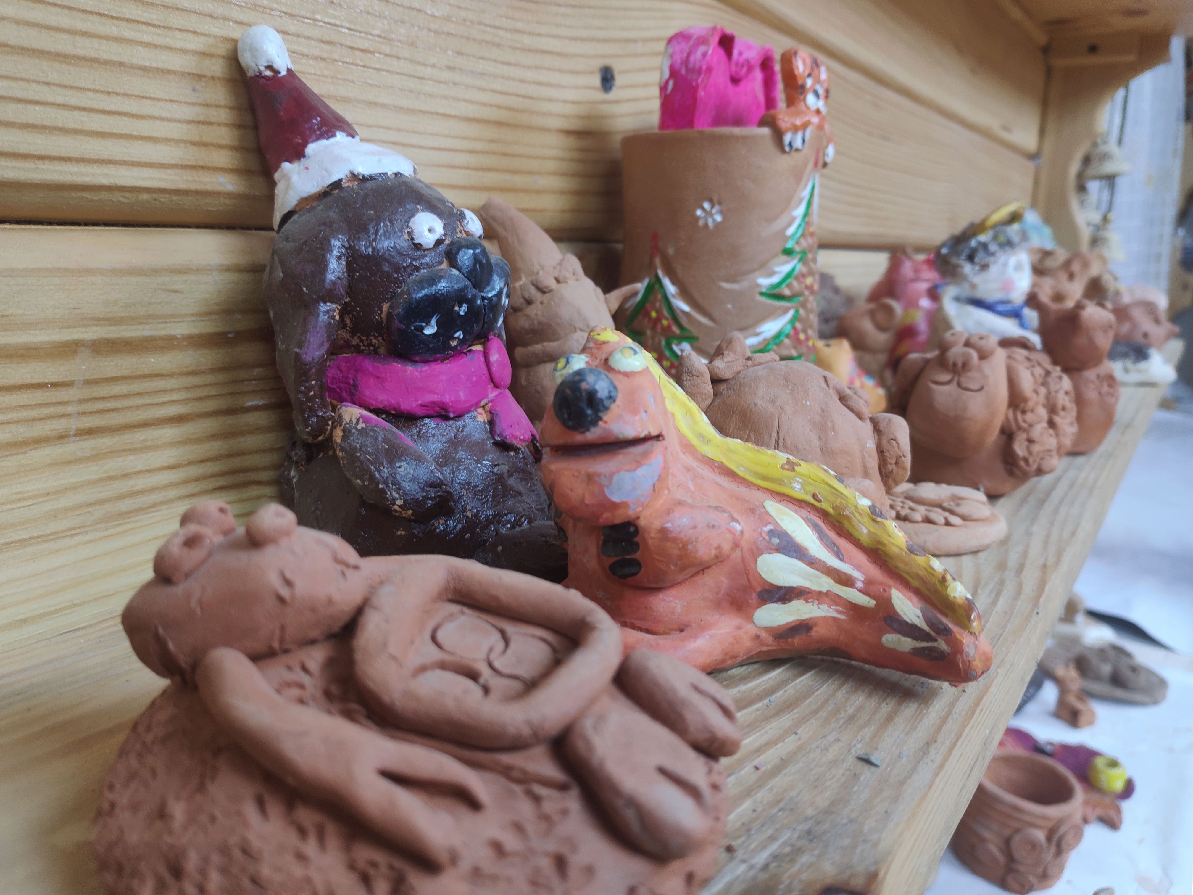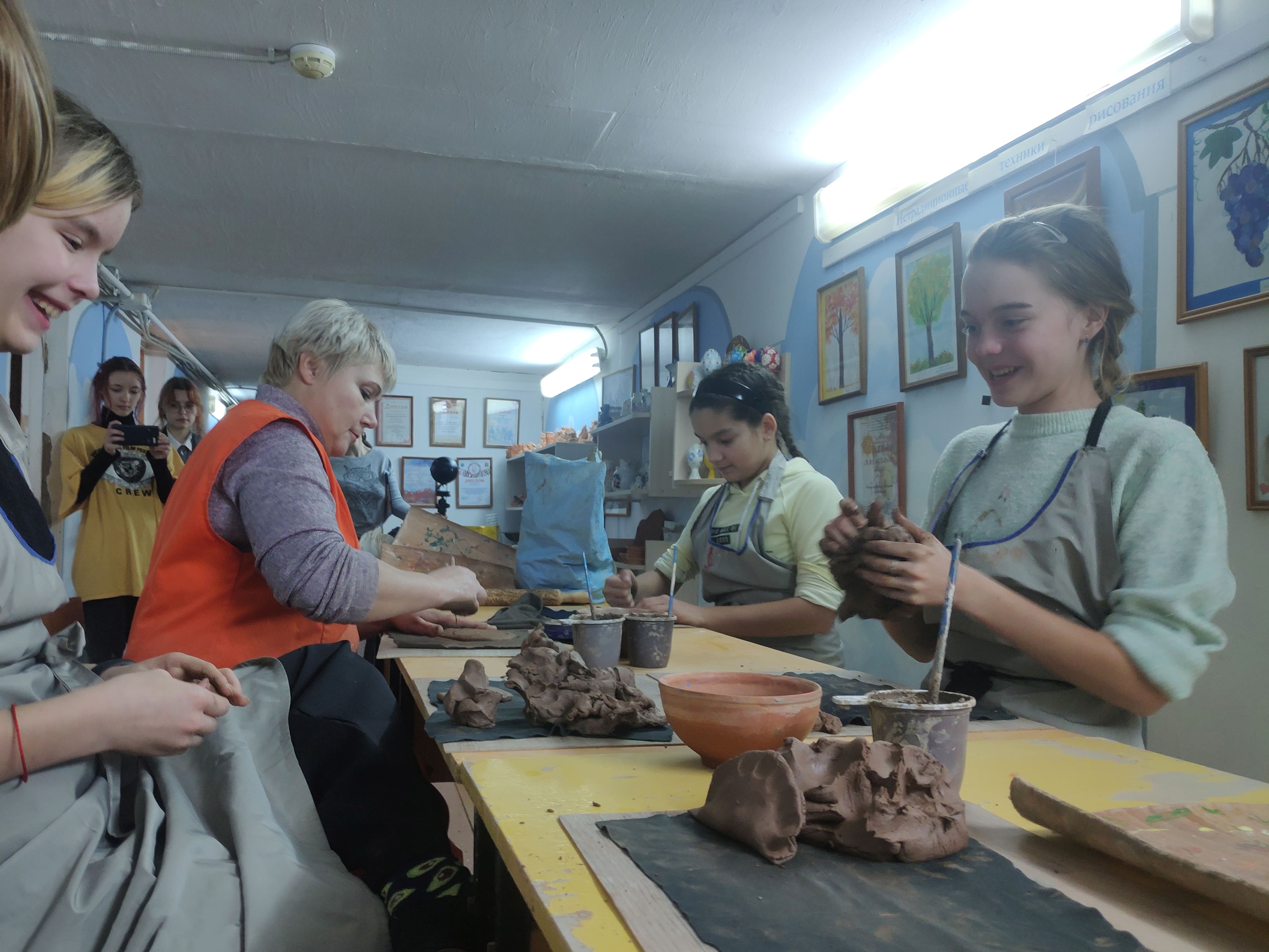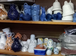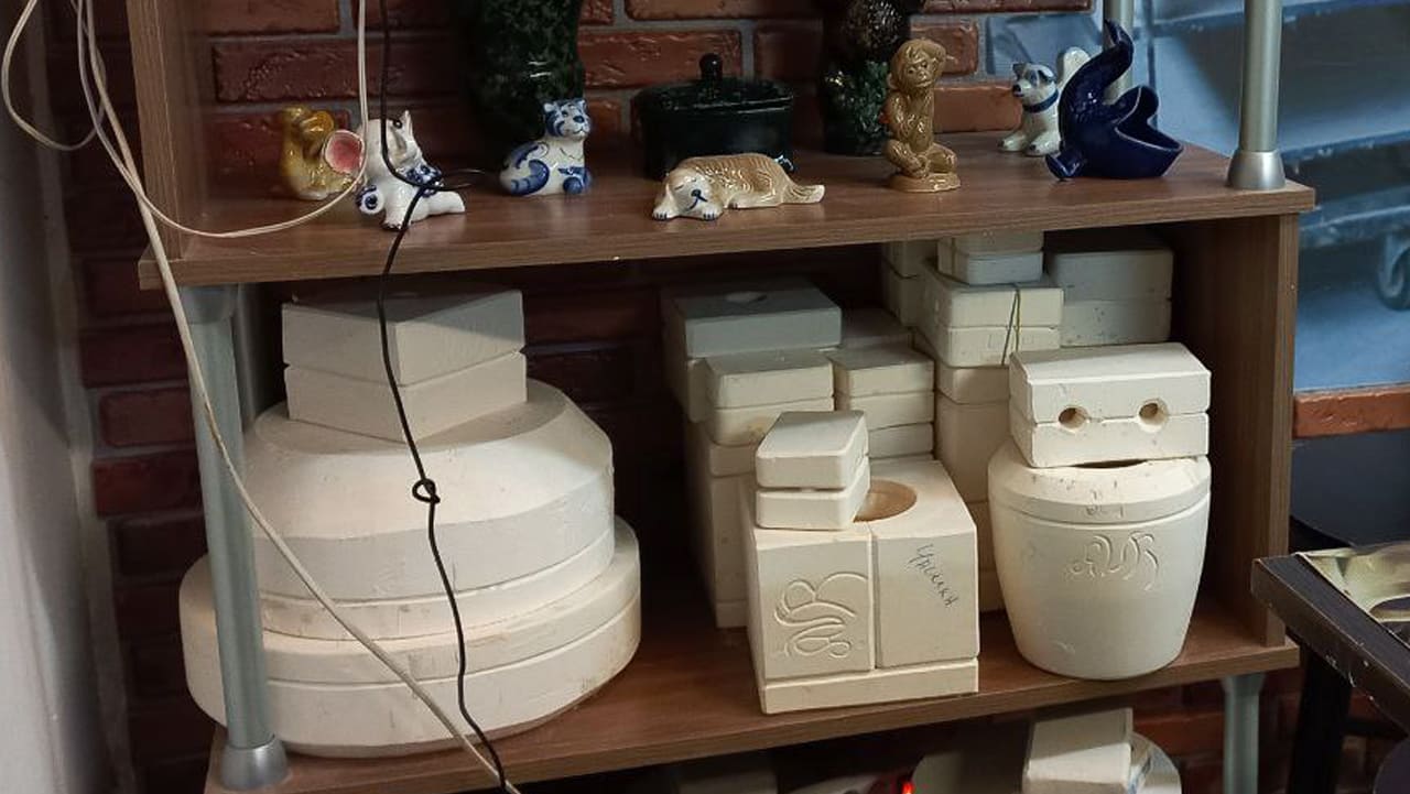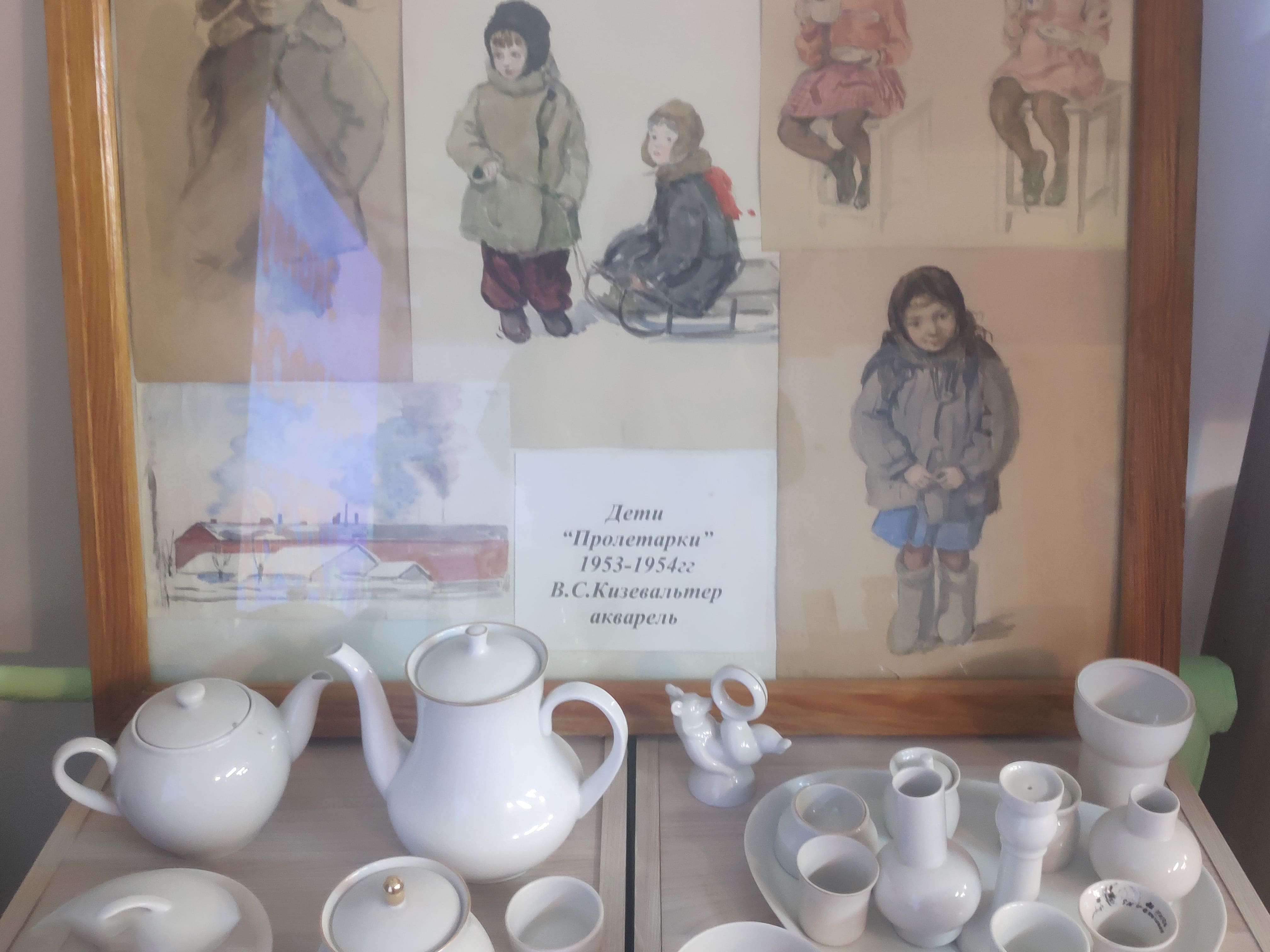 Пролетарский районный Дом культуры, на базе которого создан музей: живописный холл, детские мастерские, формы для обжига, готовые изделия и сувенирная продукция. Дата съемки: осень 2022 года.