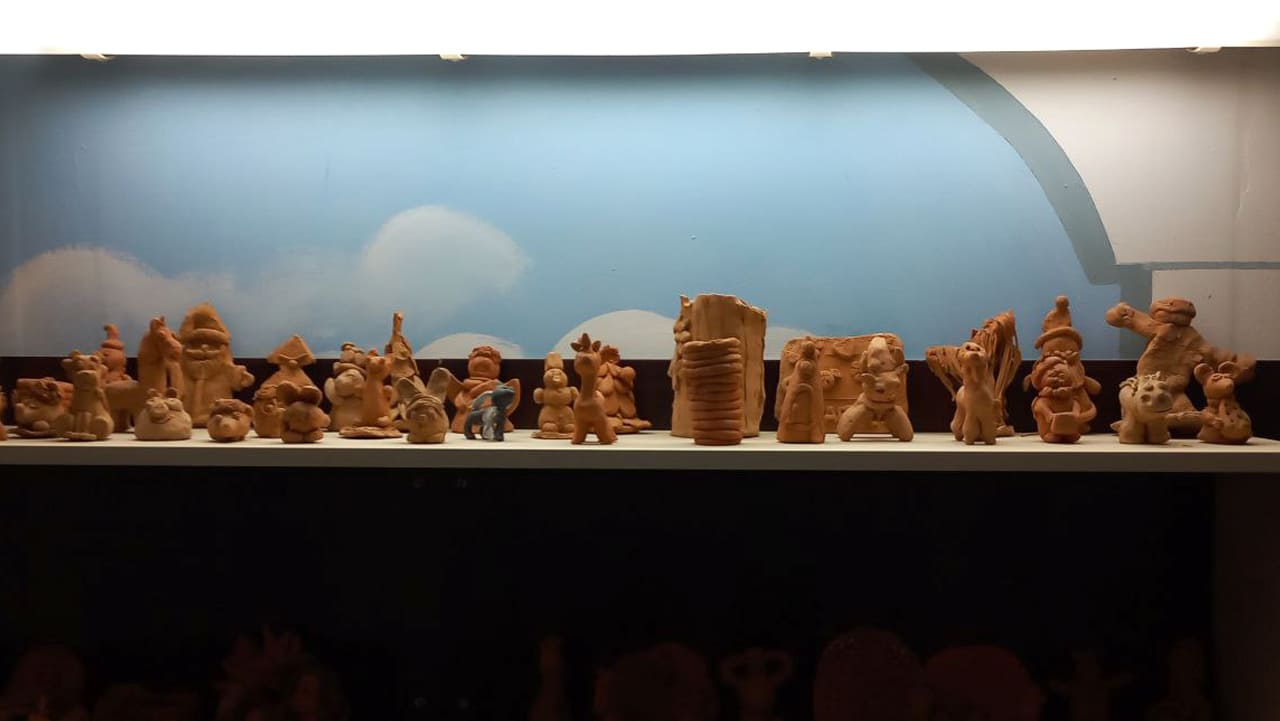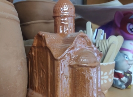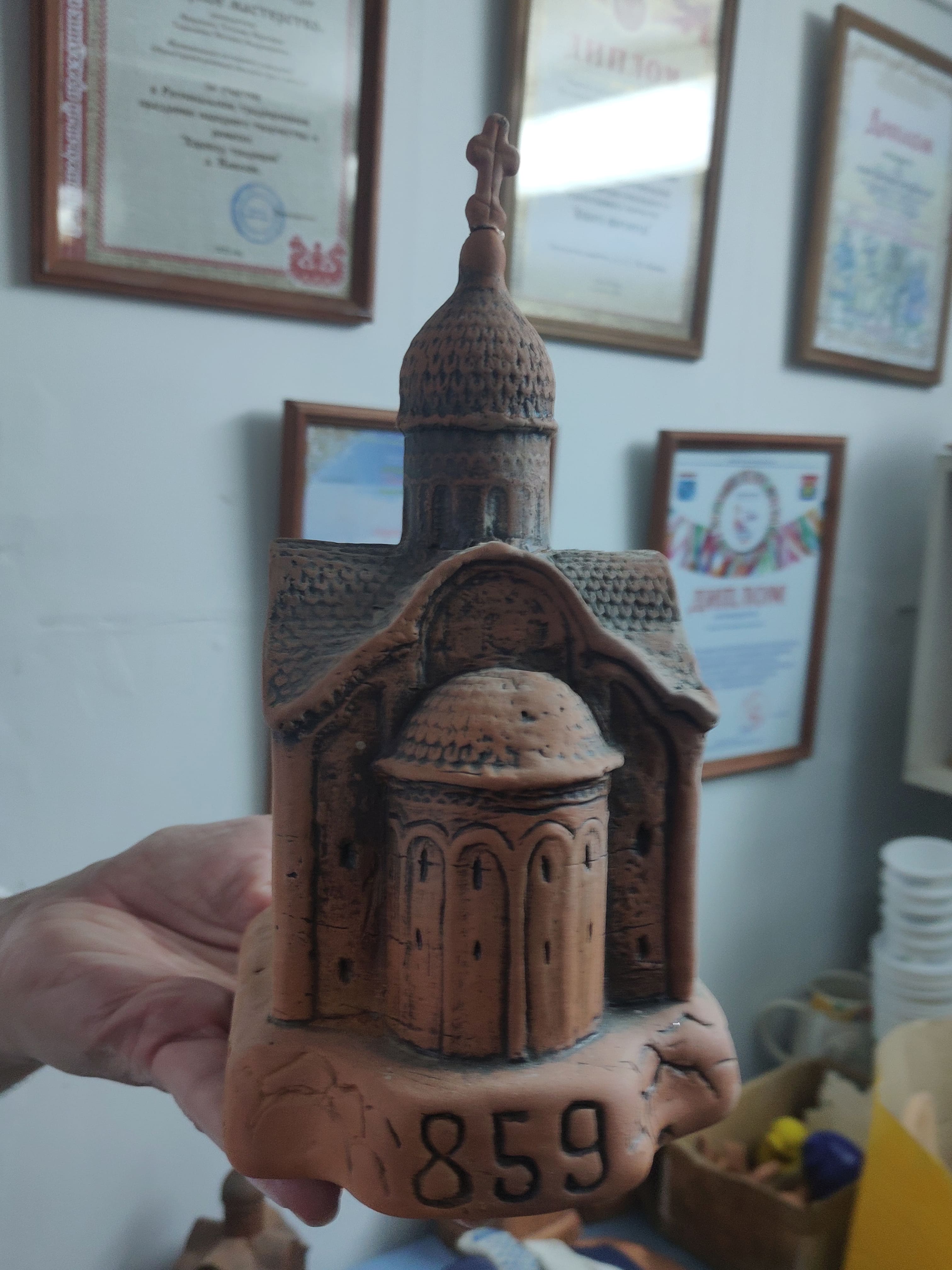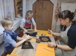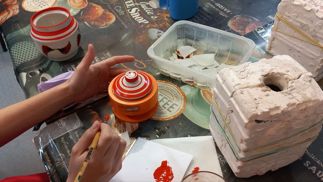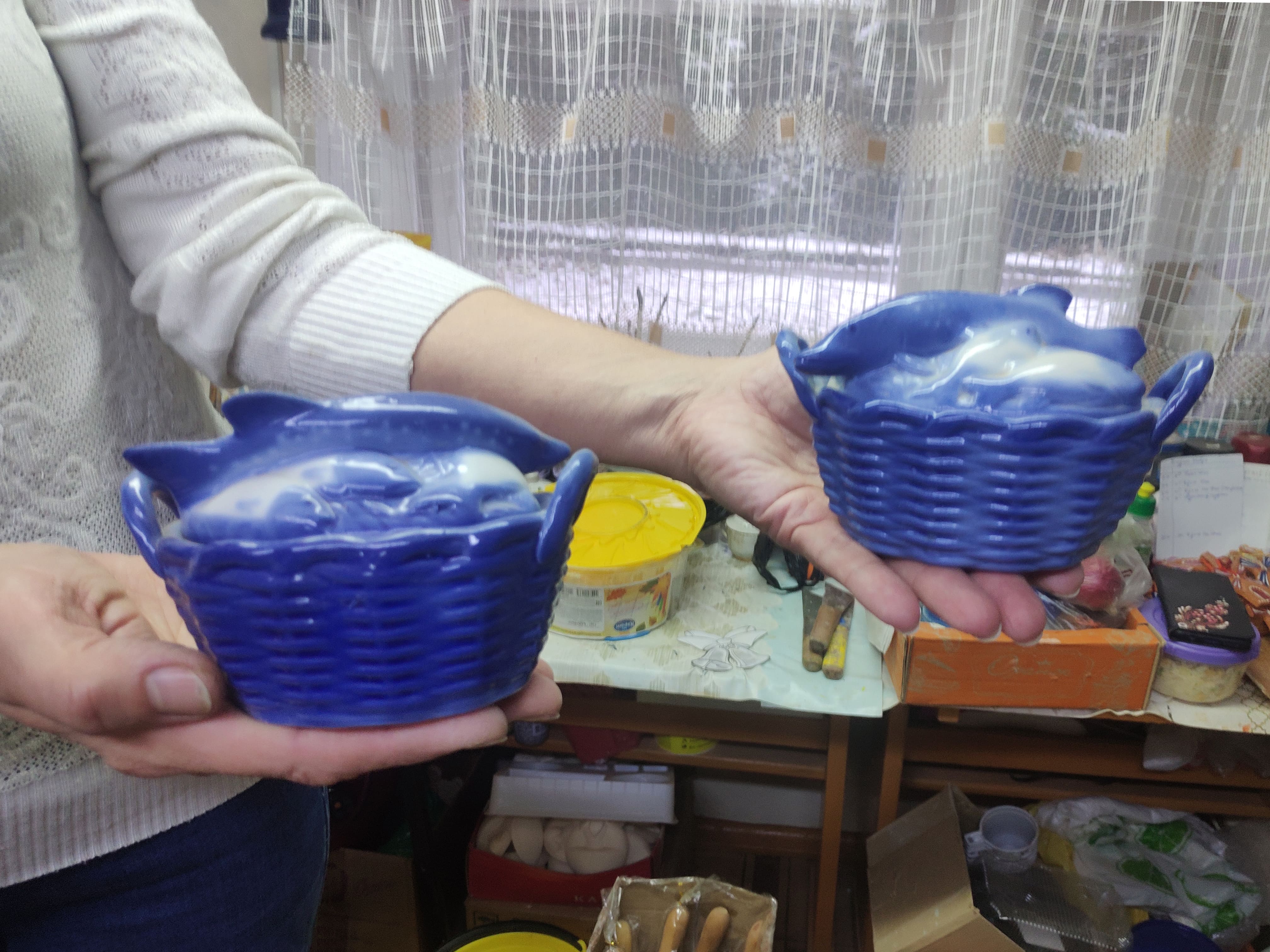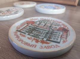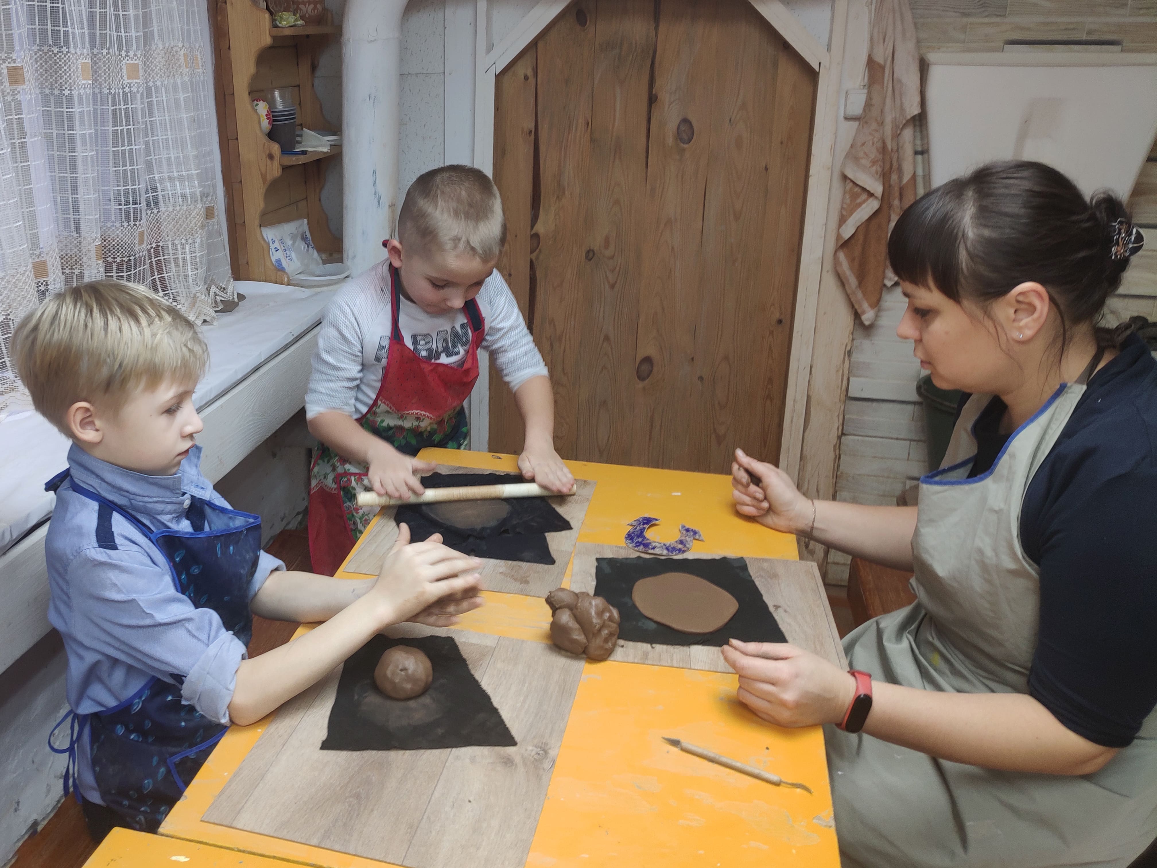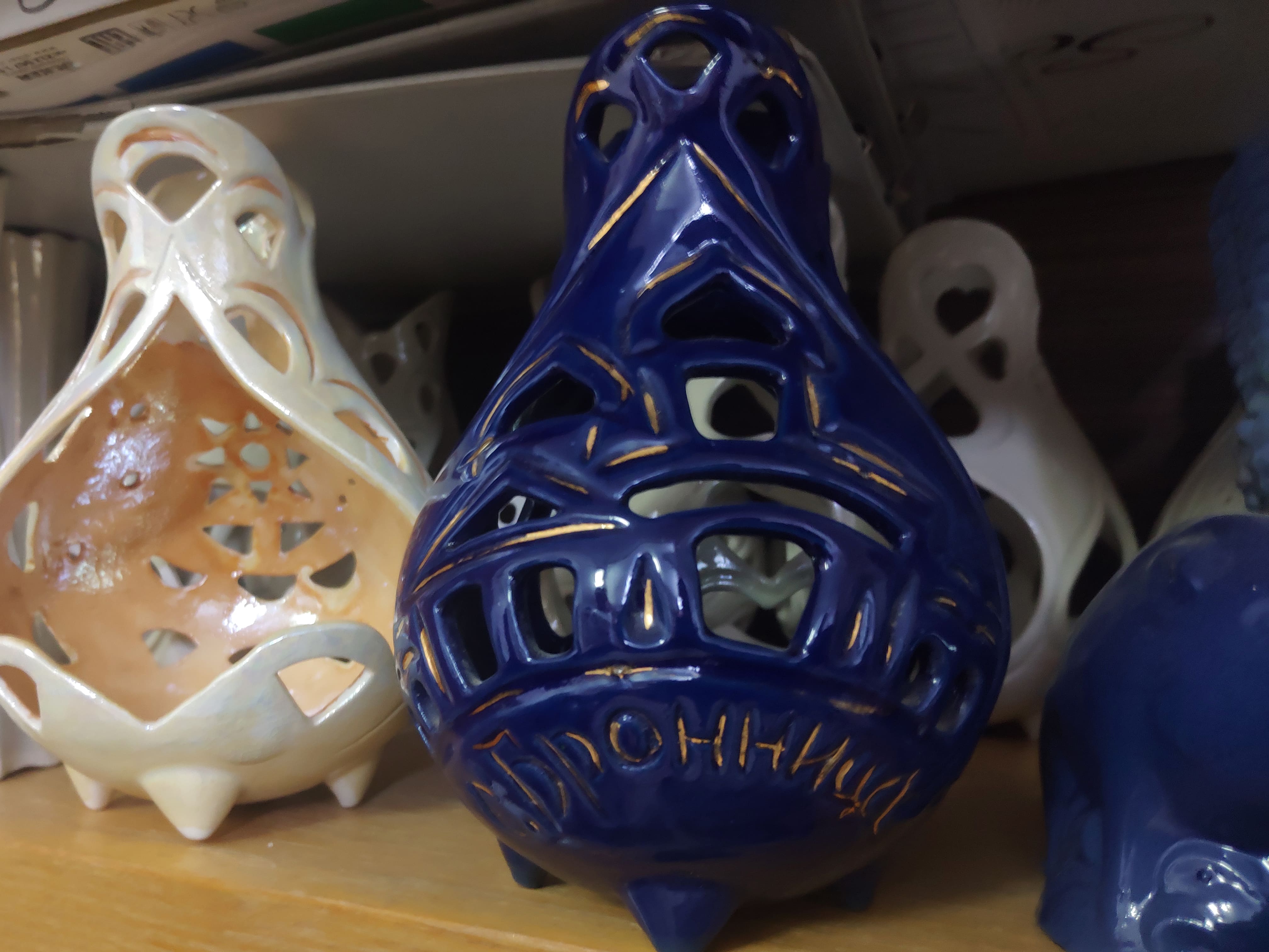 Пролетарский районный Дом культуры, на базе которого создан музей: живописный холл, детские мастерские, формы для обжига, готовые изделия и сувенирная продукция. Дата съемки: осень 2022 года.