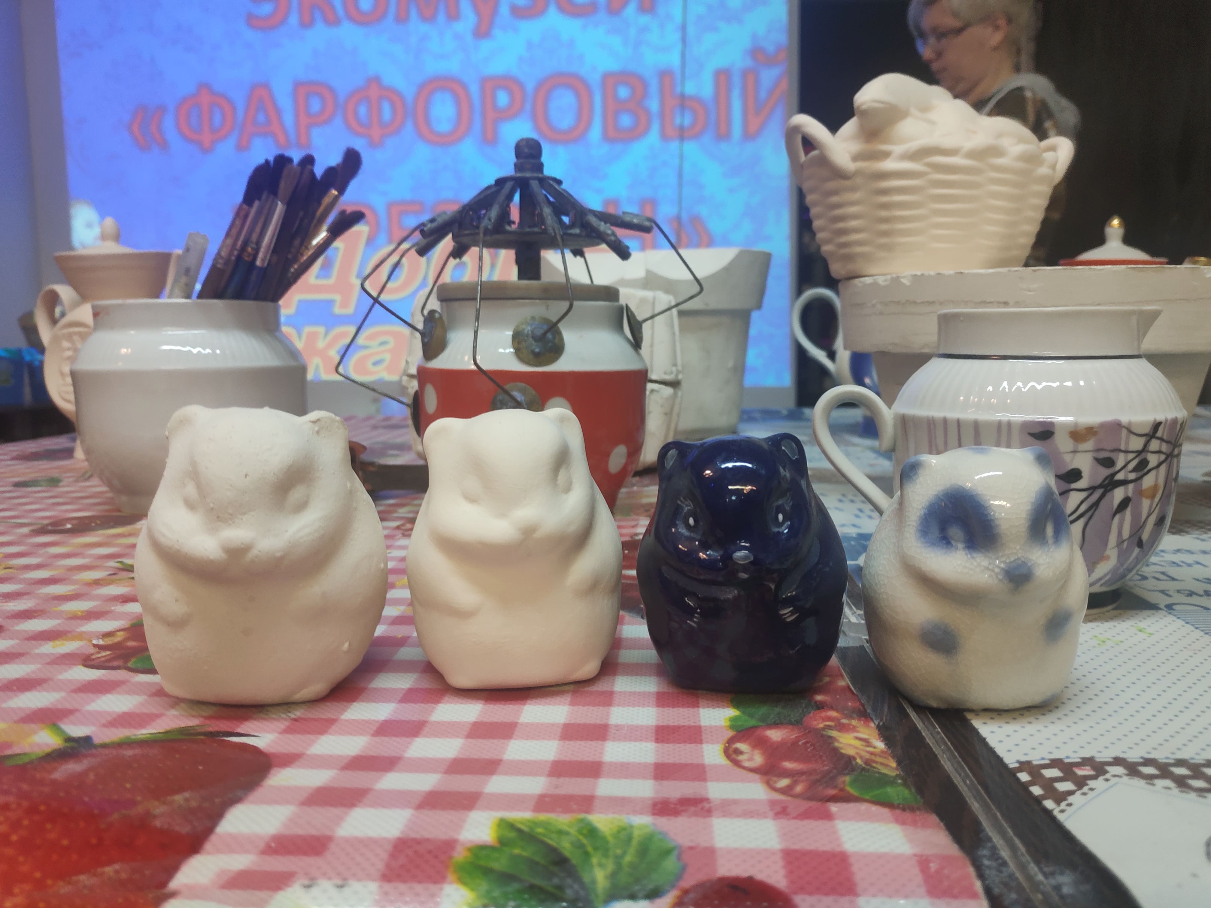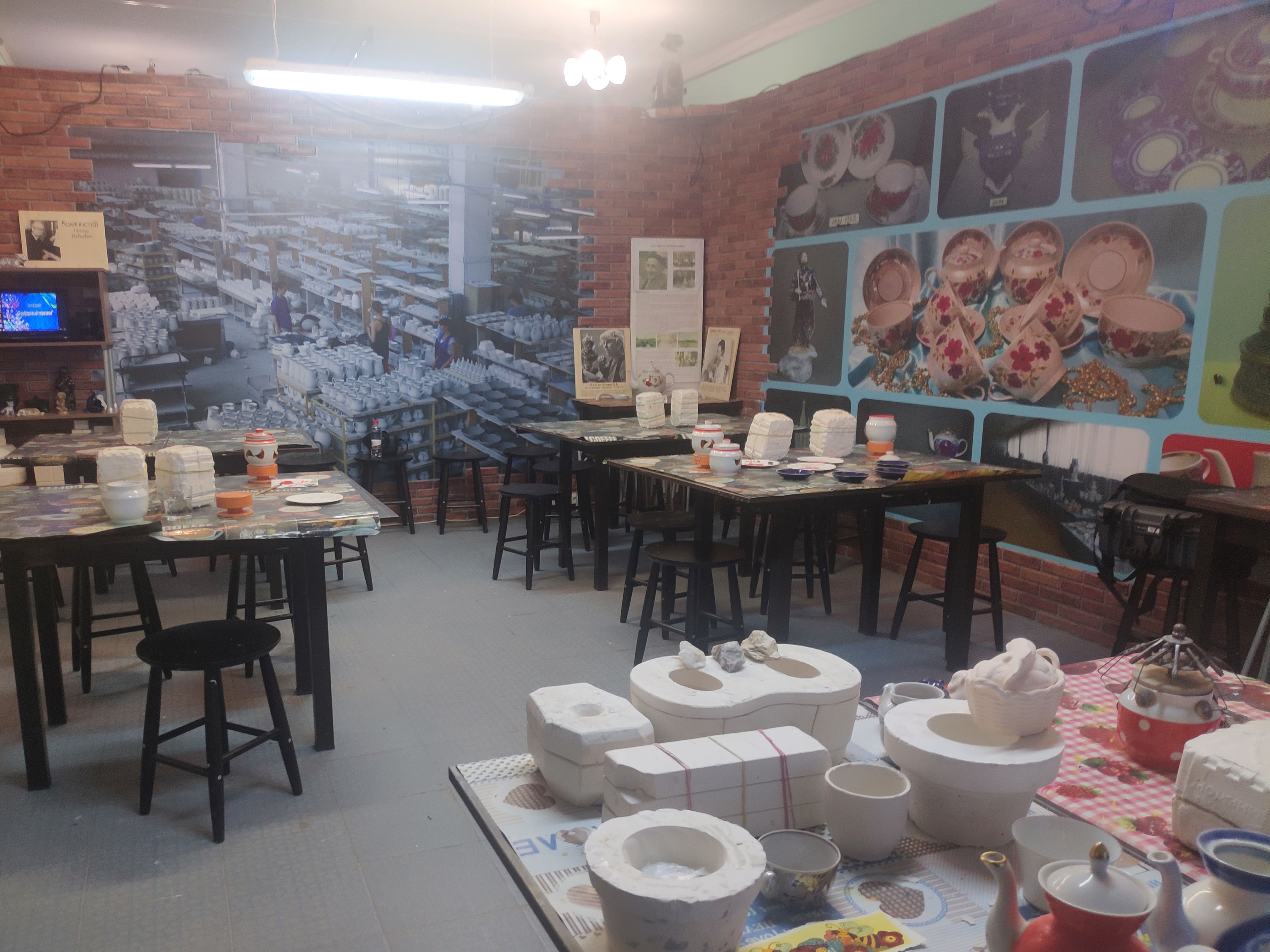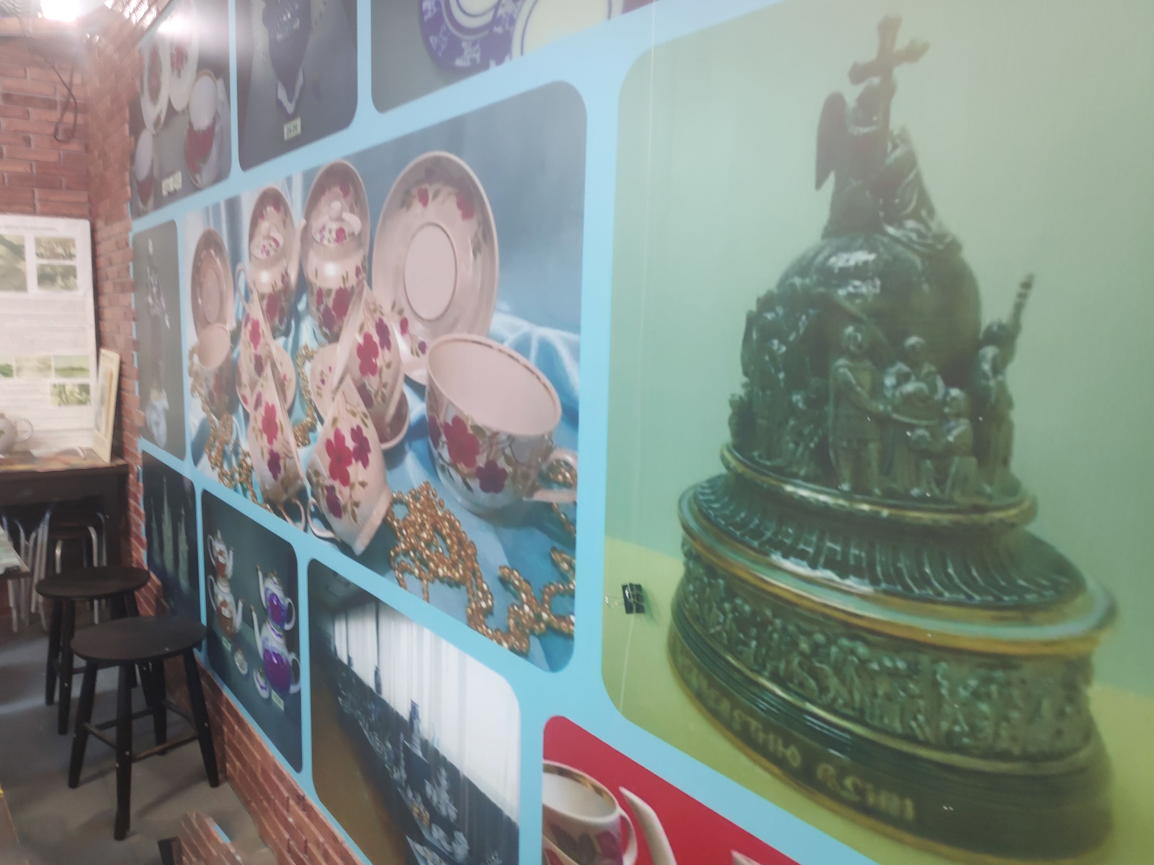 Эко-музей «Фарфоровый перезвон»: интерьеры, информационные материалы, выставочные изделия, мастер-классы по работе с жидким фарфором и росписи. Дата съемки: осень 2022 года.