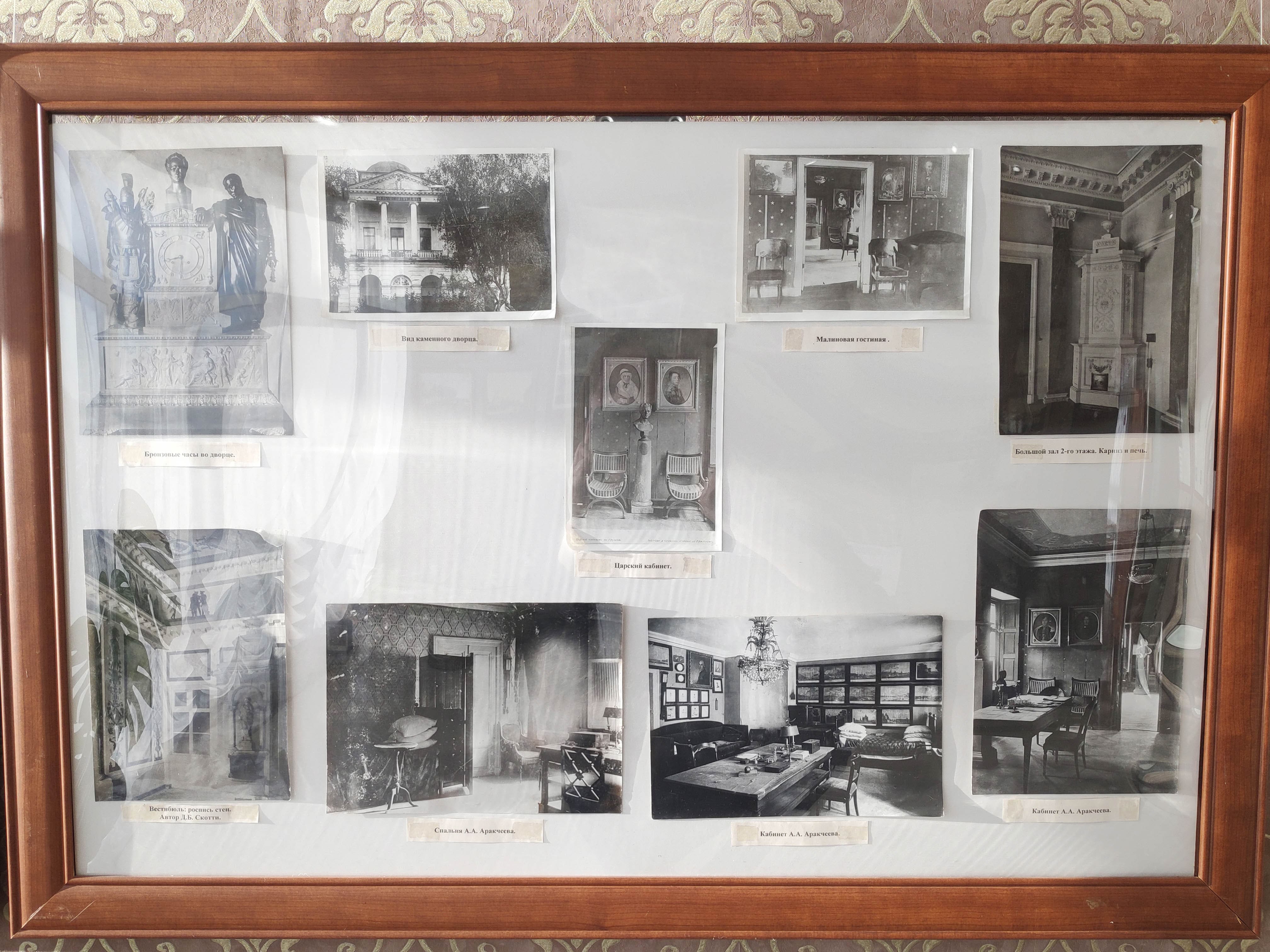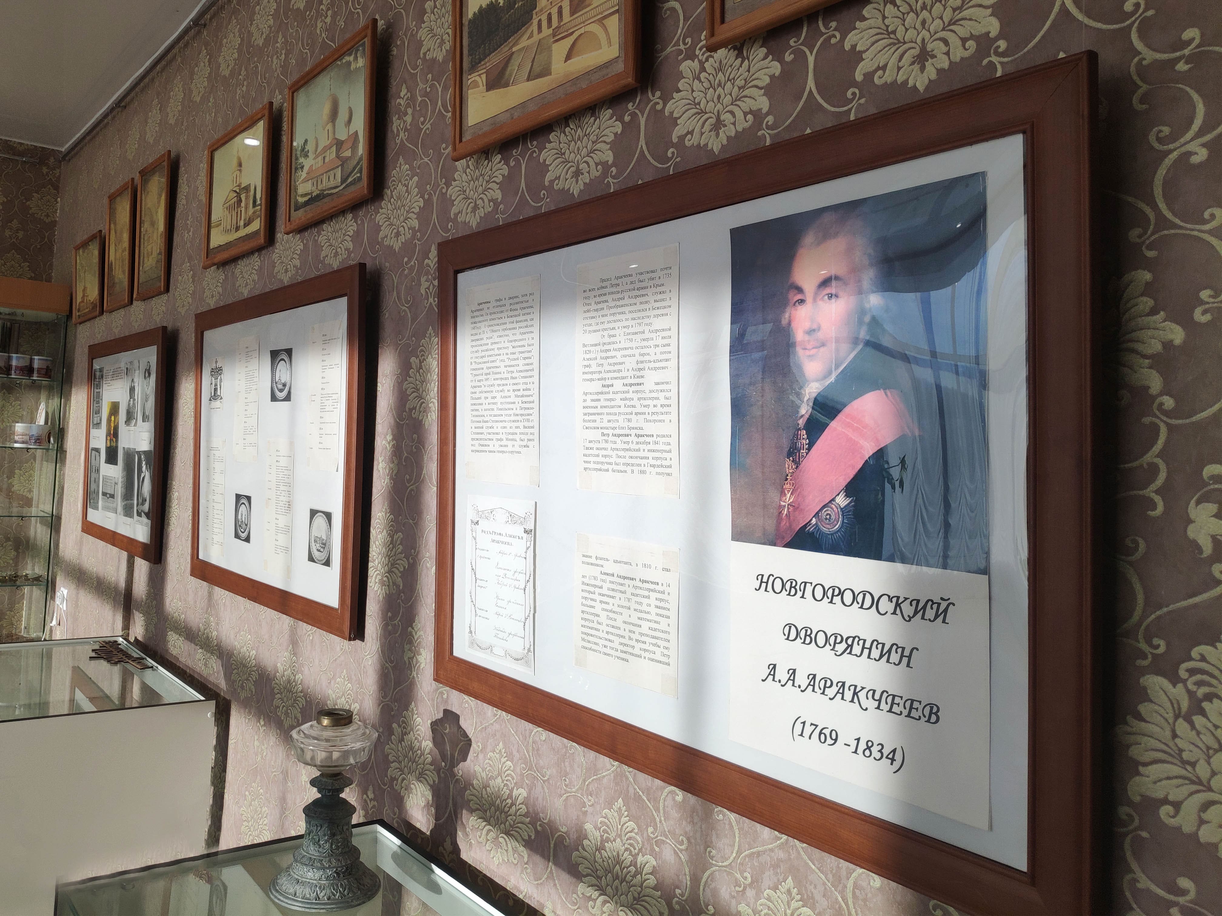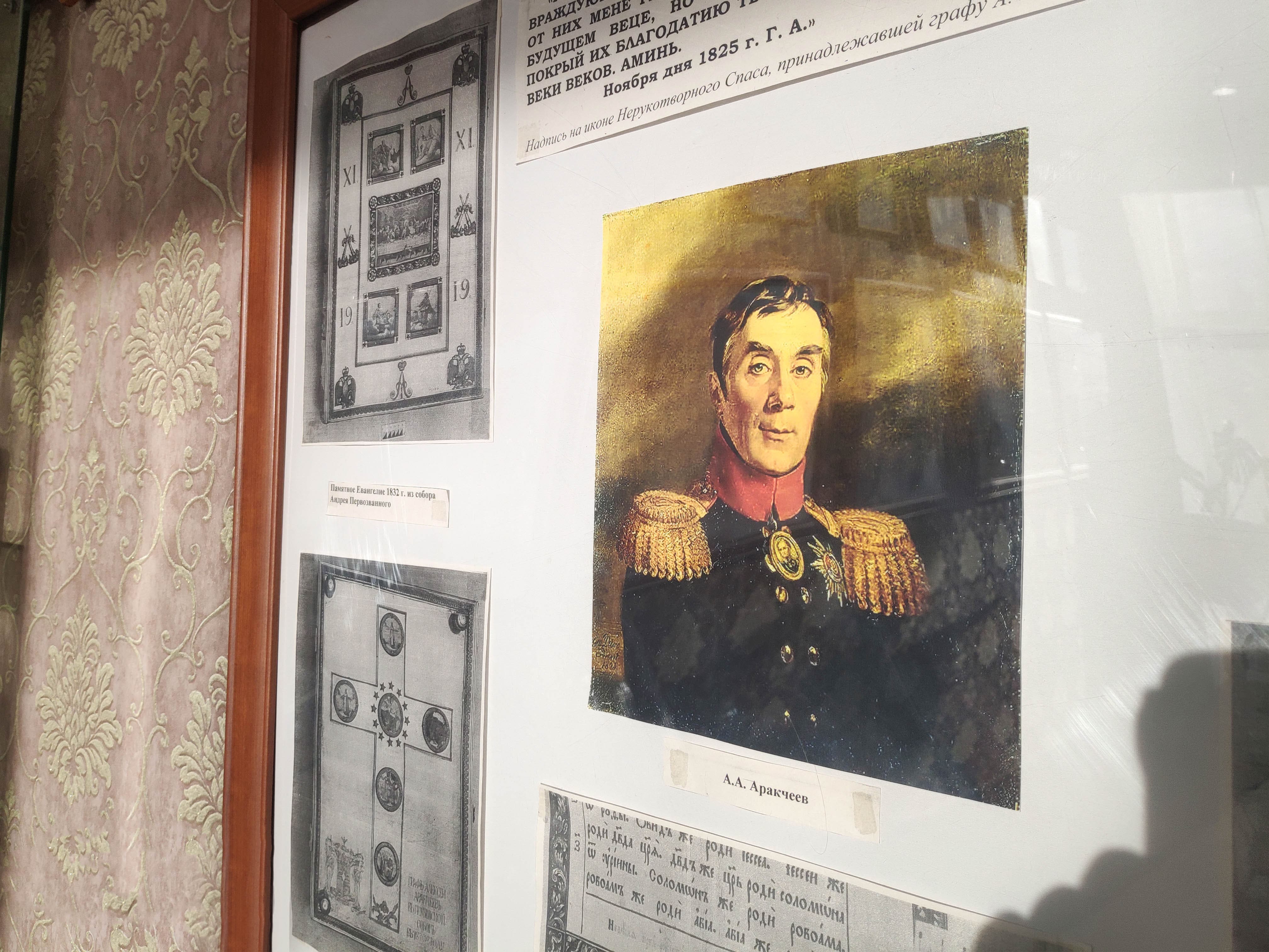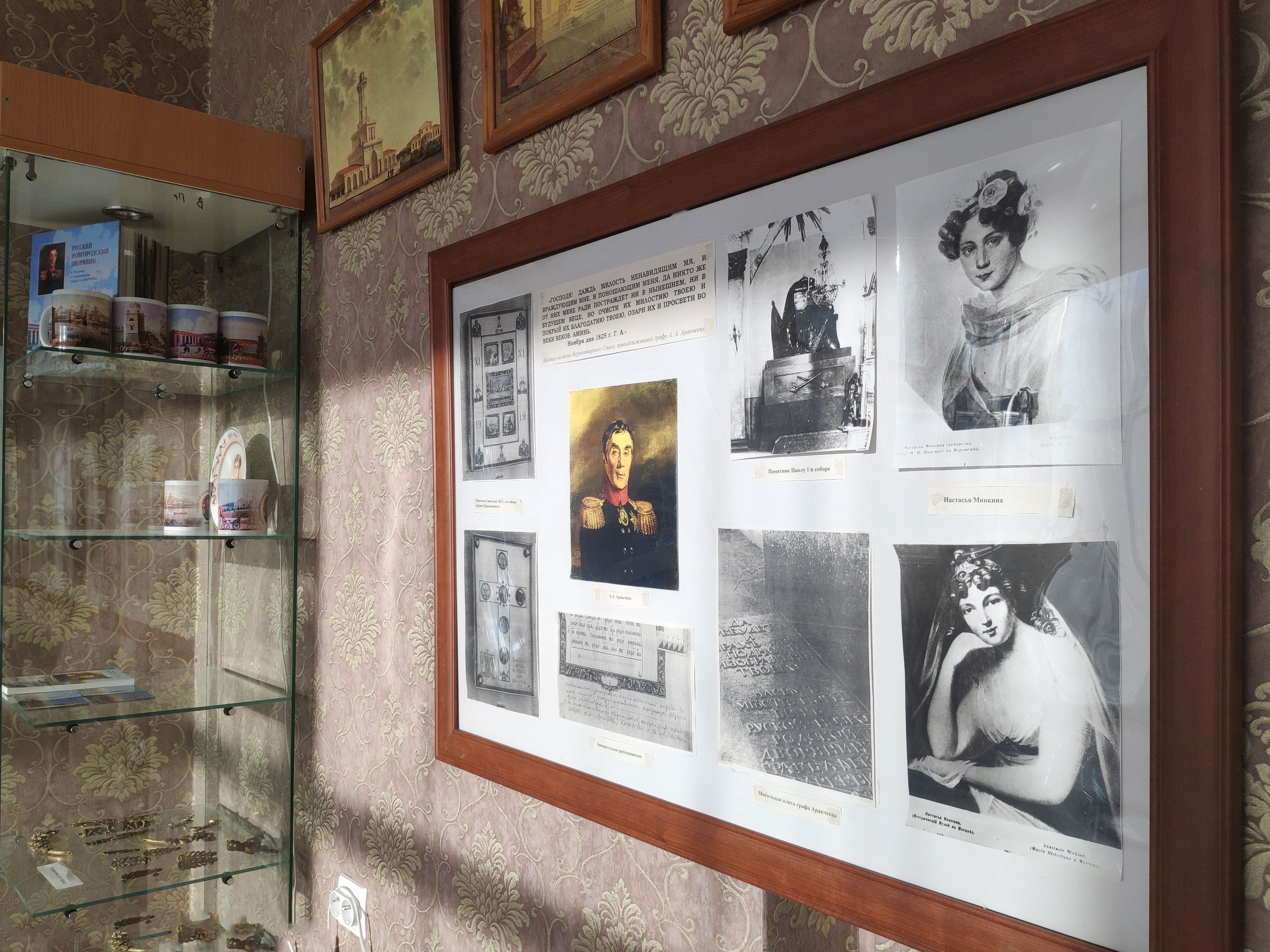 Музейная экспозиция, посвященная графу А.А. Аракчееву в Грузинском центре народного творчества и досуга: памятный знак при входе в центр, вход в музейную комнату, фрагменты экспозиций, исторический генеральный план села Грузина в коридоре центра. Дата съемки: осень 2022 года.