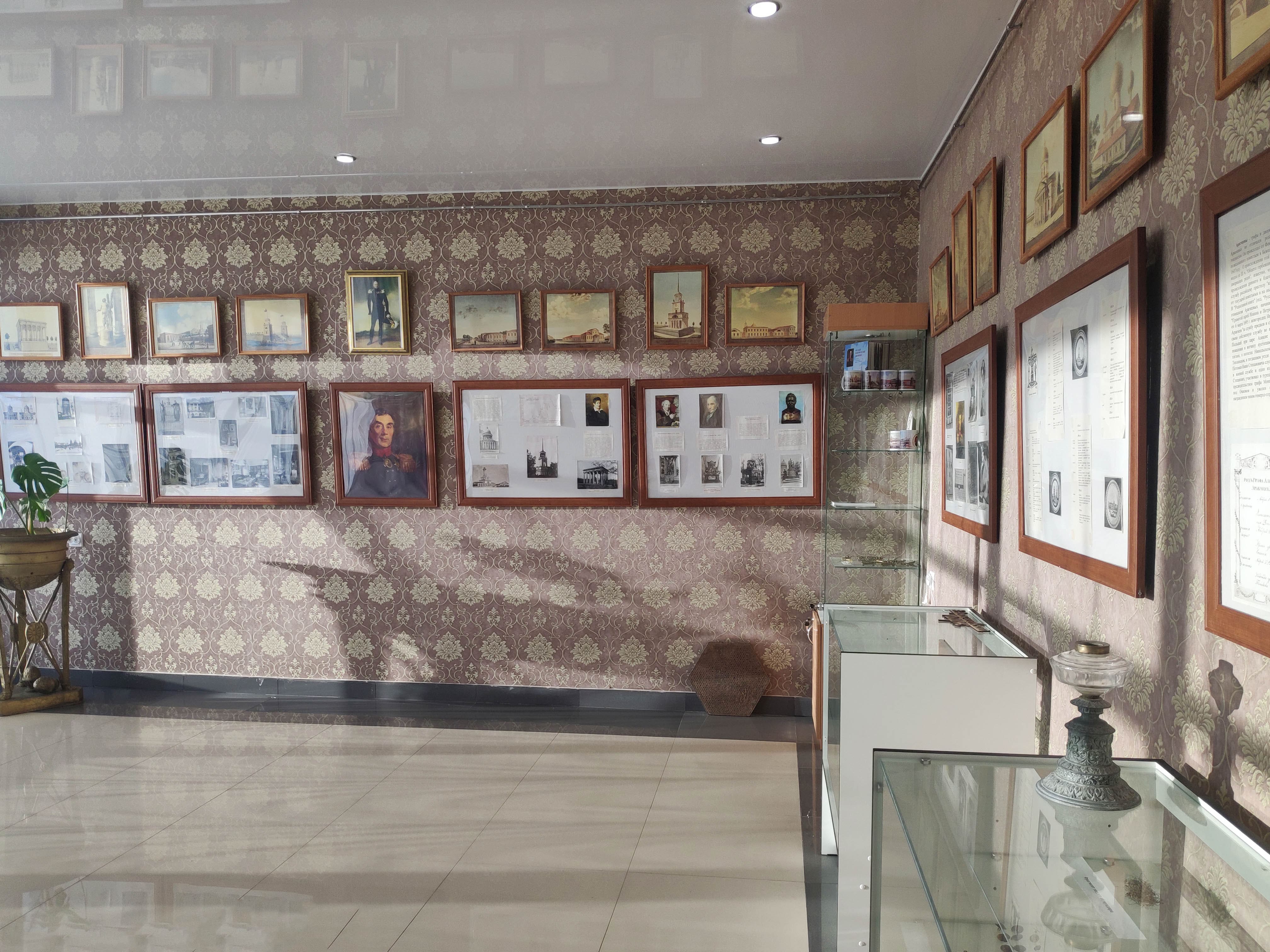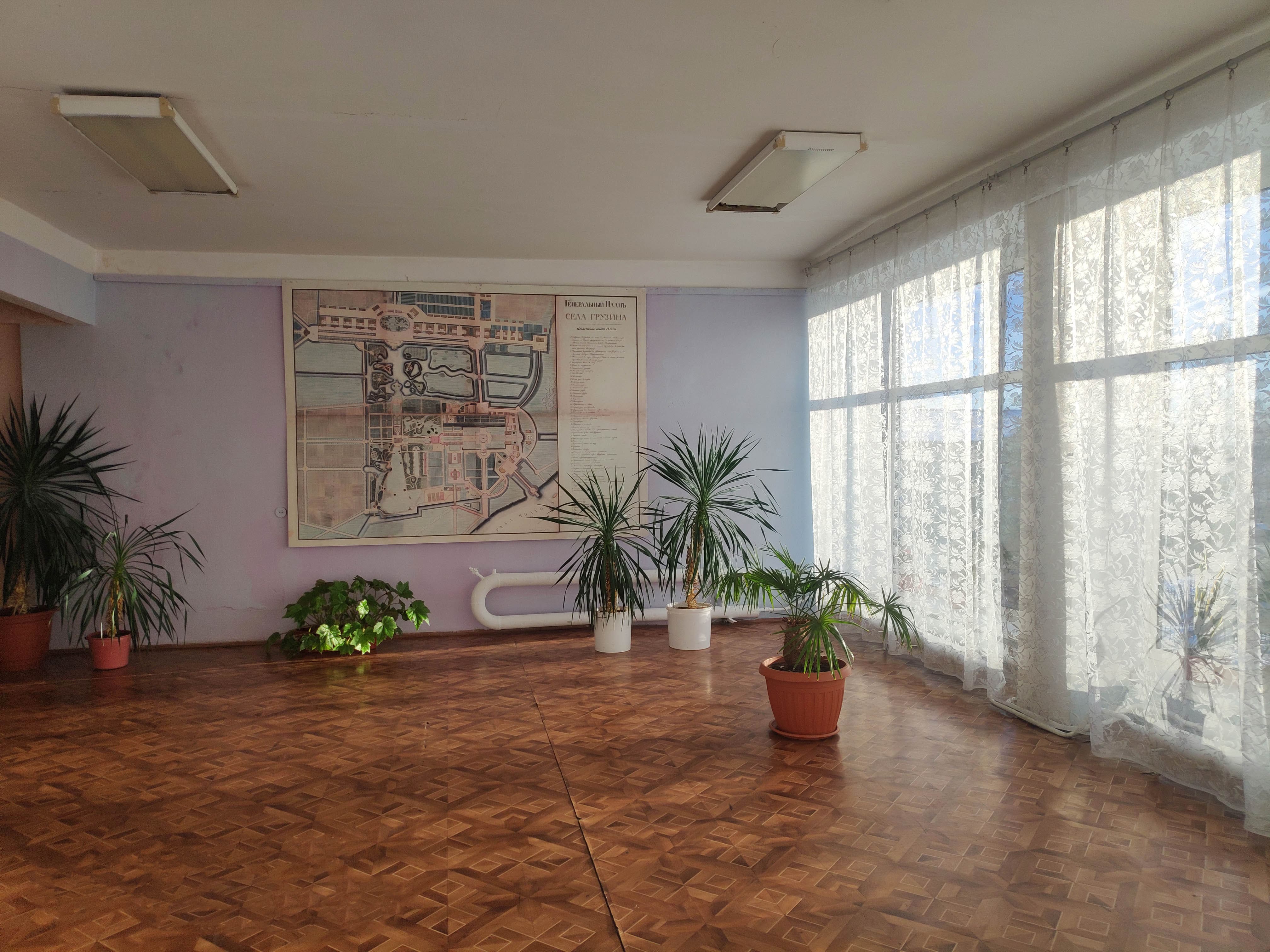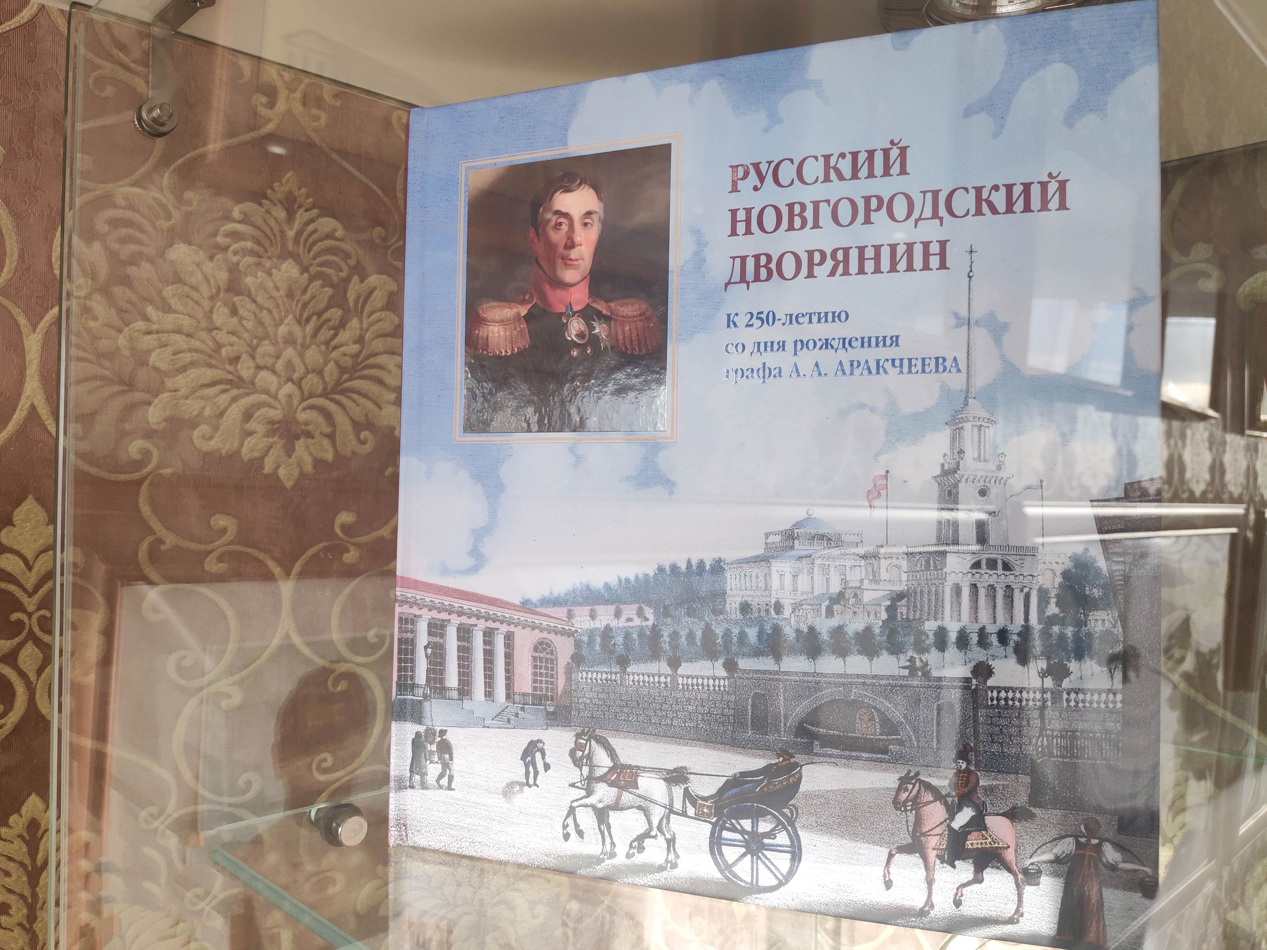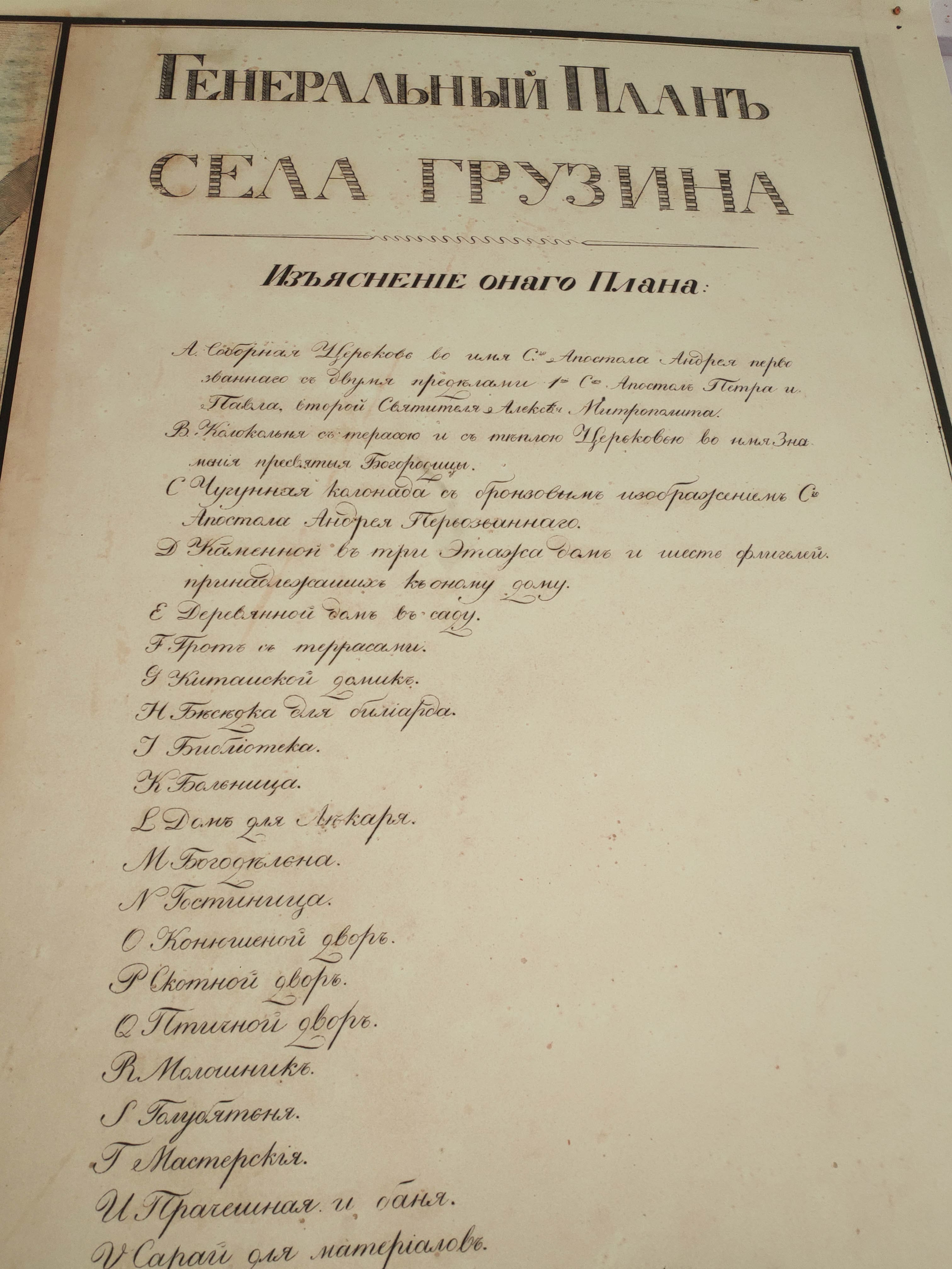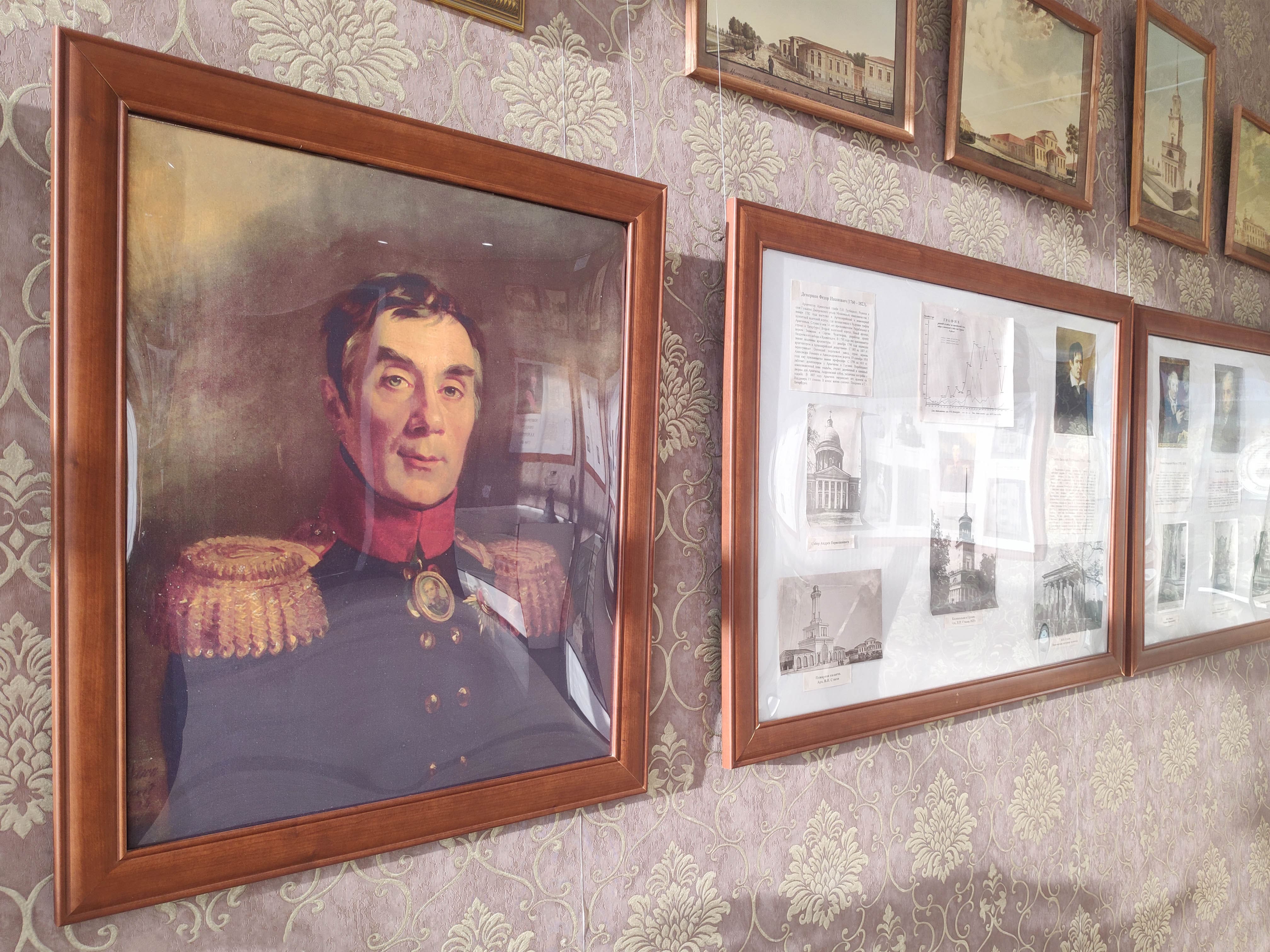 Музейная экспозиция, посвященная графу А.А. Аракчееву в Грузинском центре народного творчества и досуга: памятный знак при входе в центр, вход в музейную комнату, фрагменты экспозиций, исторический генеральный план села Грузина в коридоре центра. Дата съемки: осень 2022 года.