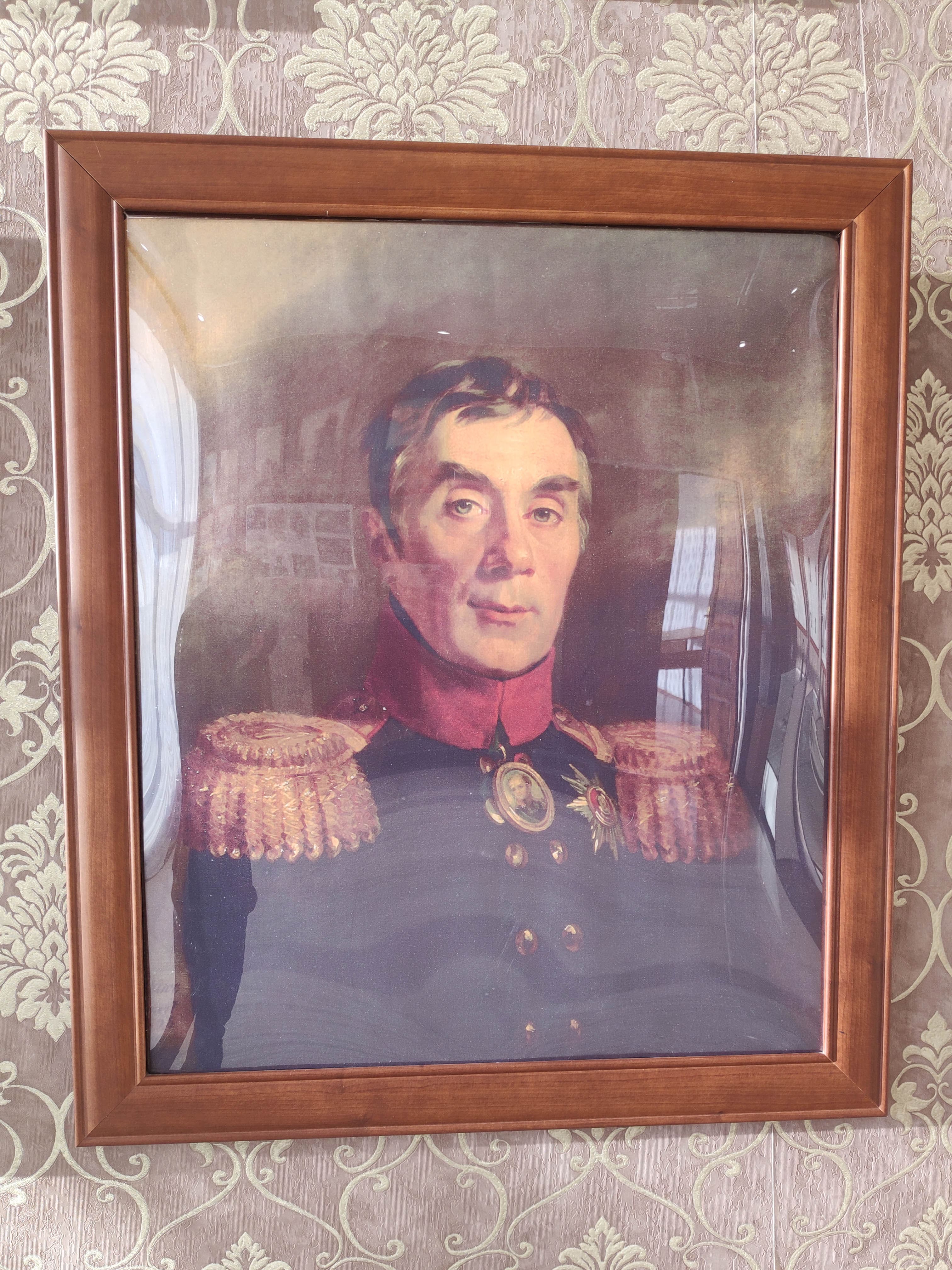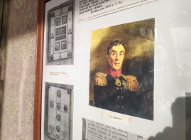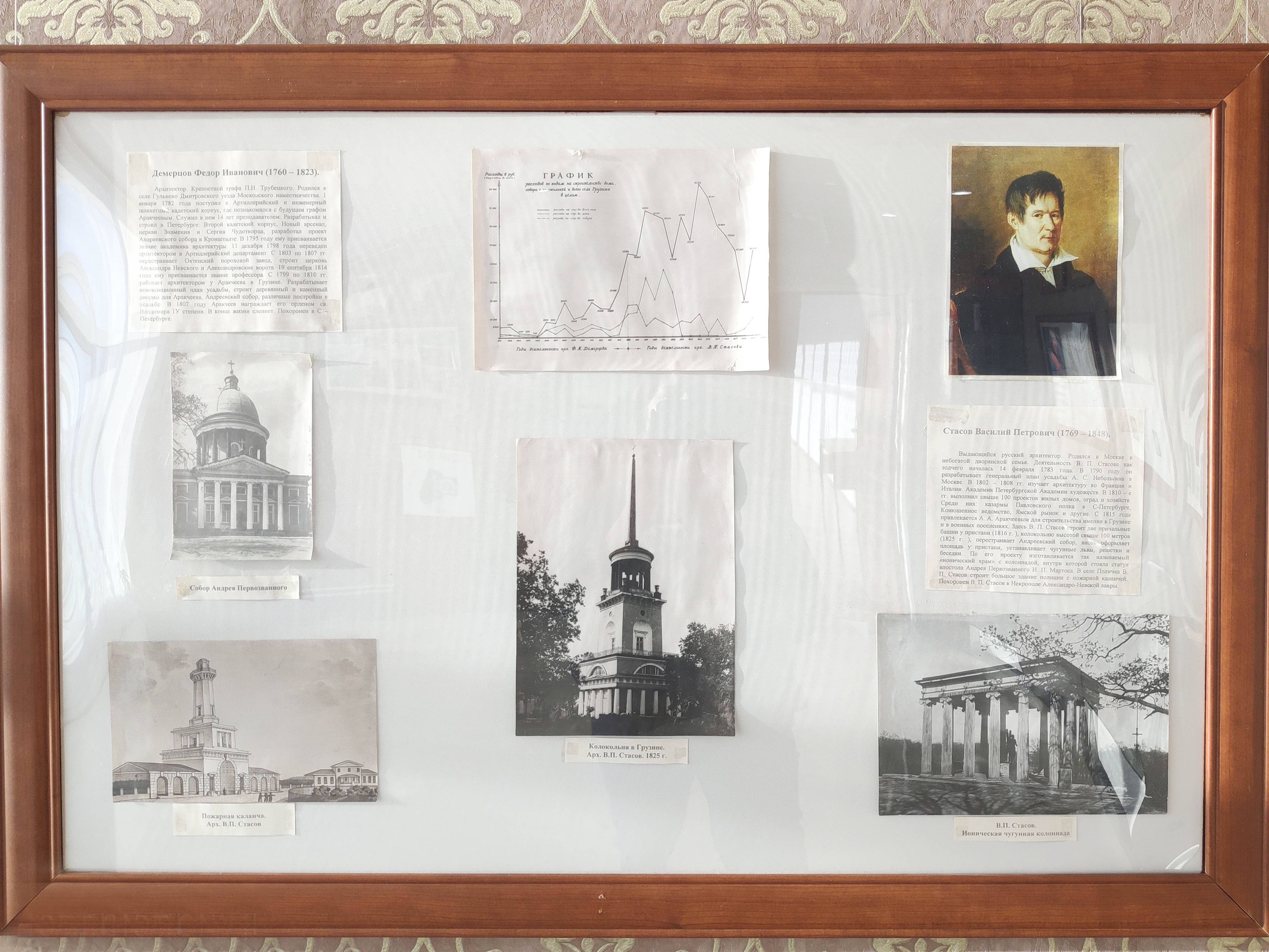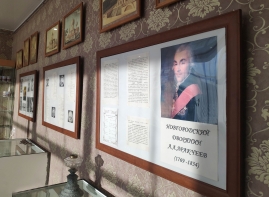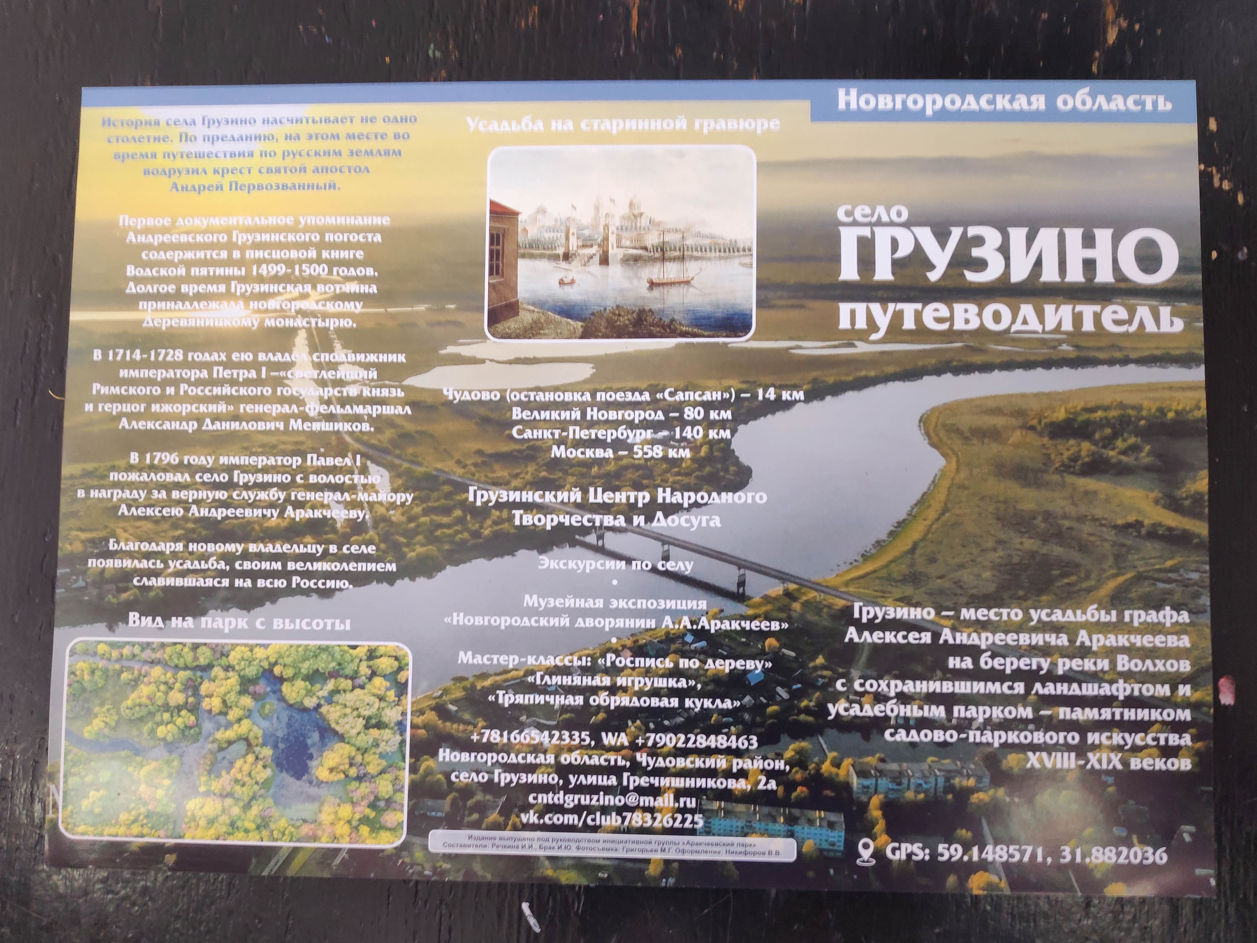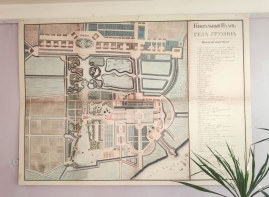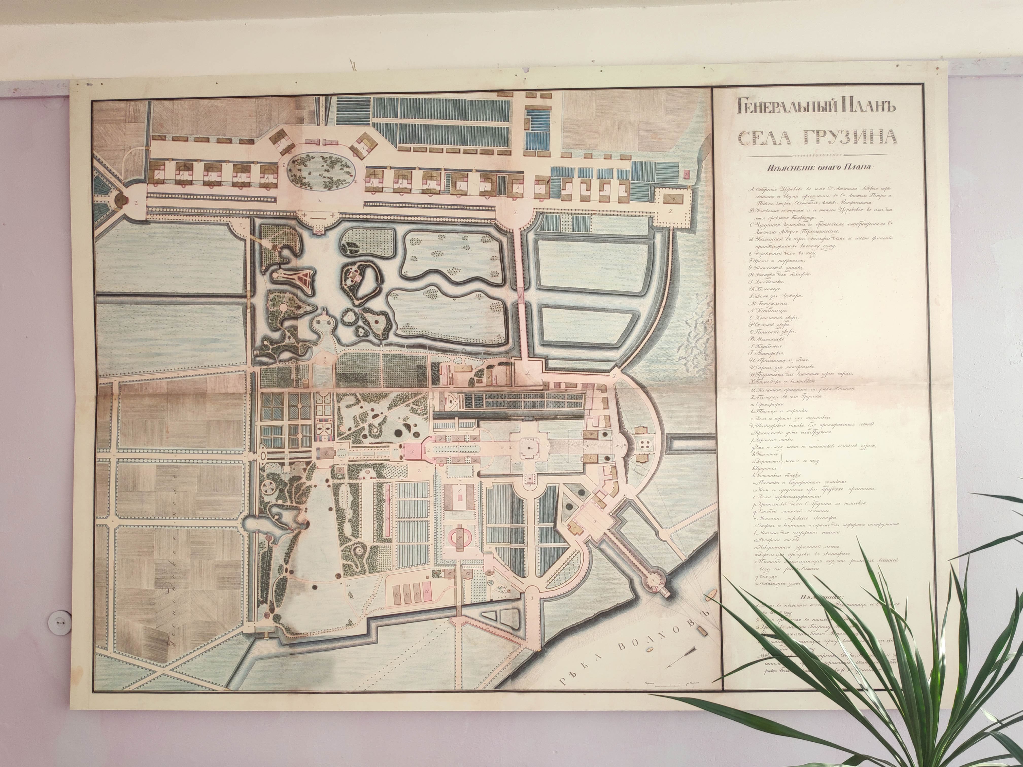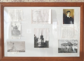 Музейная экспозиция, посвященная графу А.А. Аракчееву в Грузинском центре народного творчества и досуга: памятный знак при входе в центр, вход в музейную комнату, фрагменты экспозиций, исторический генеральный план села Грузина в коридоре центра. Дата съемки: осень 2022 года.