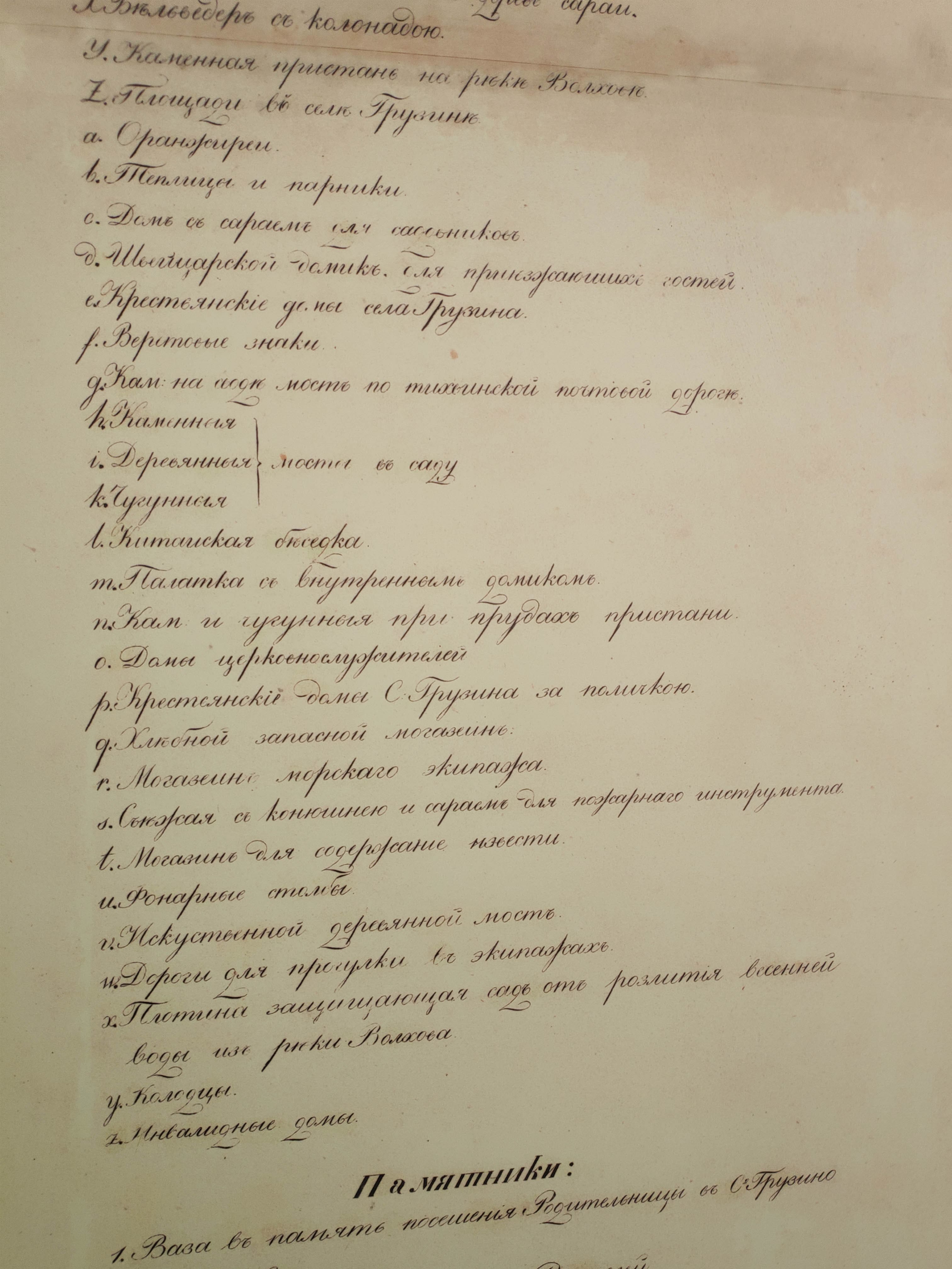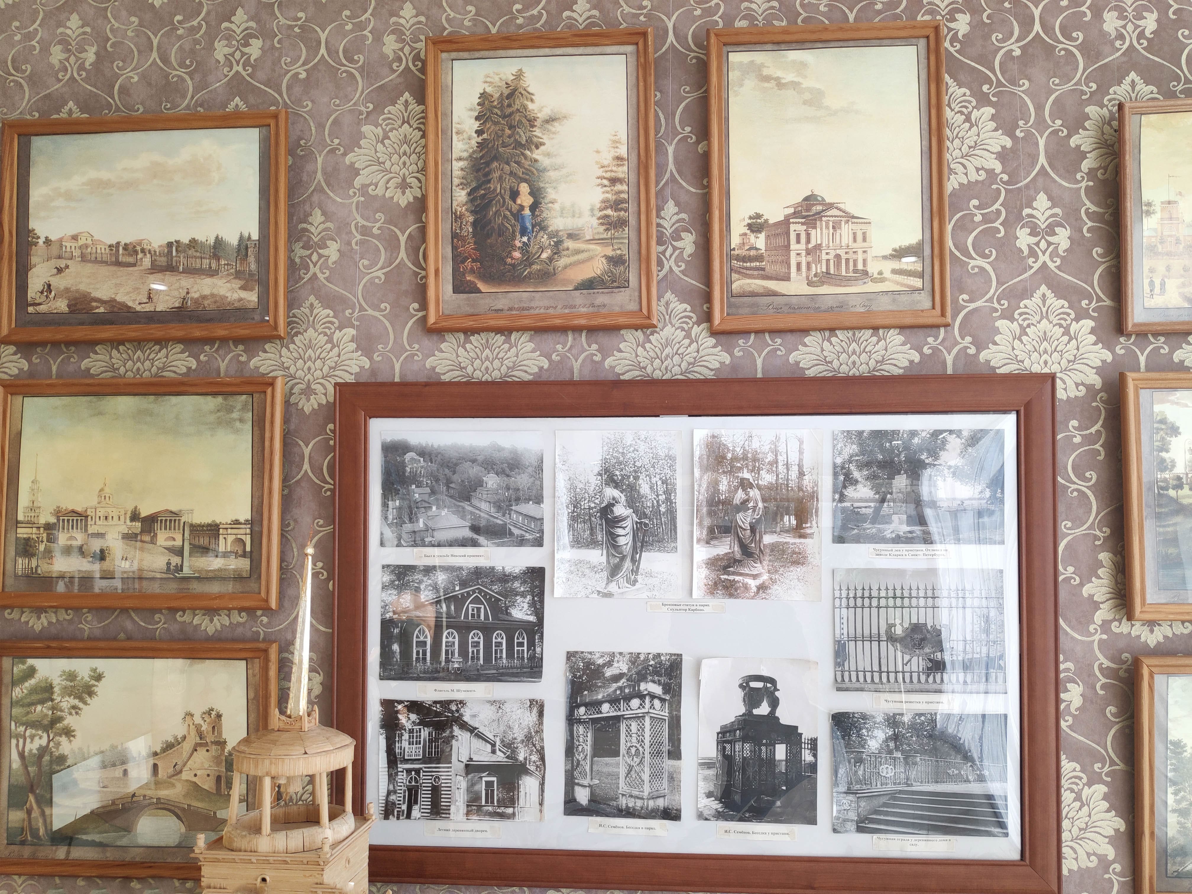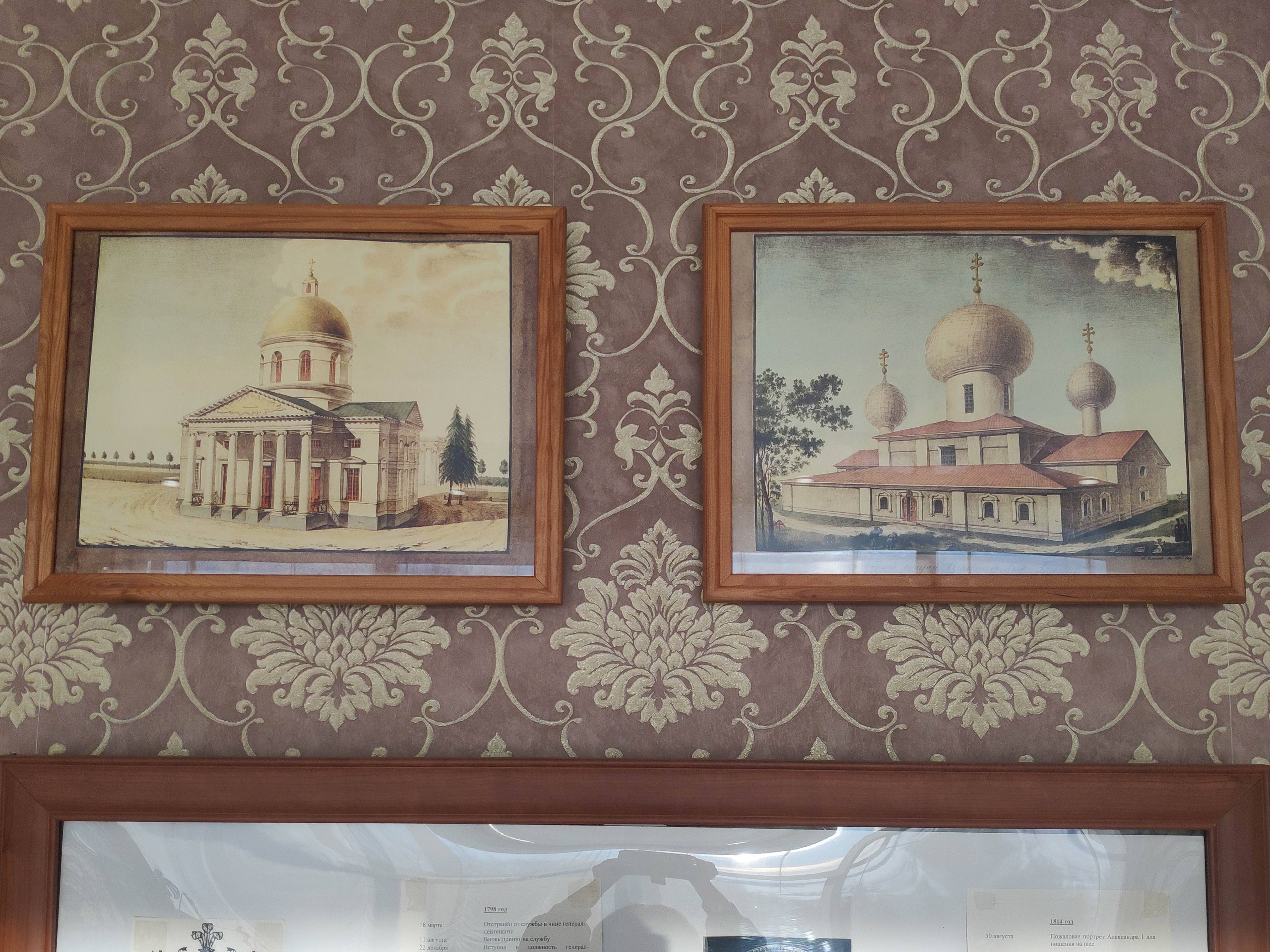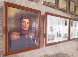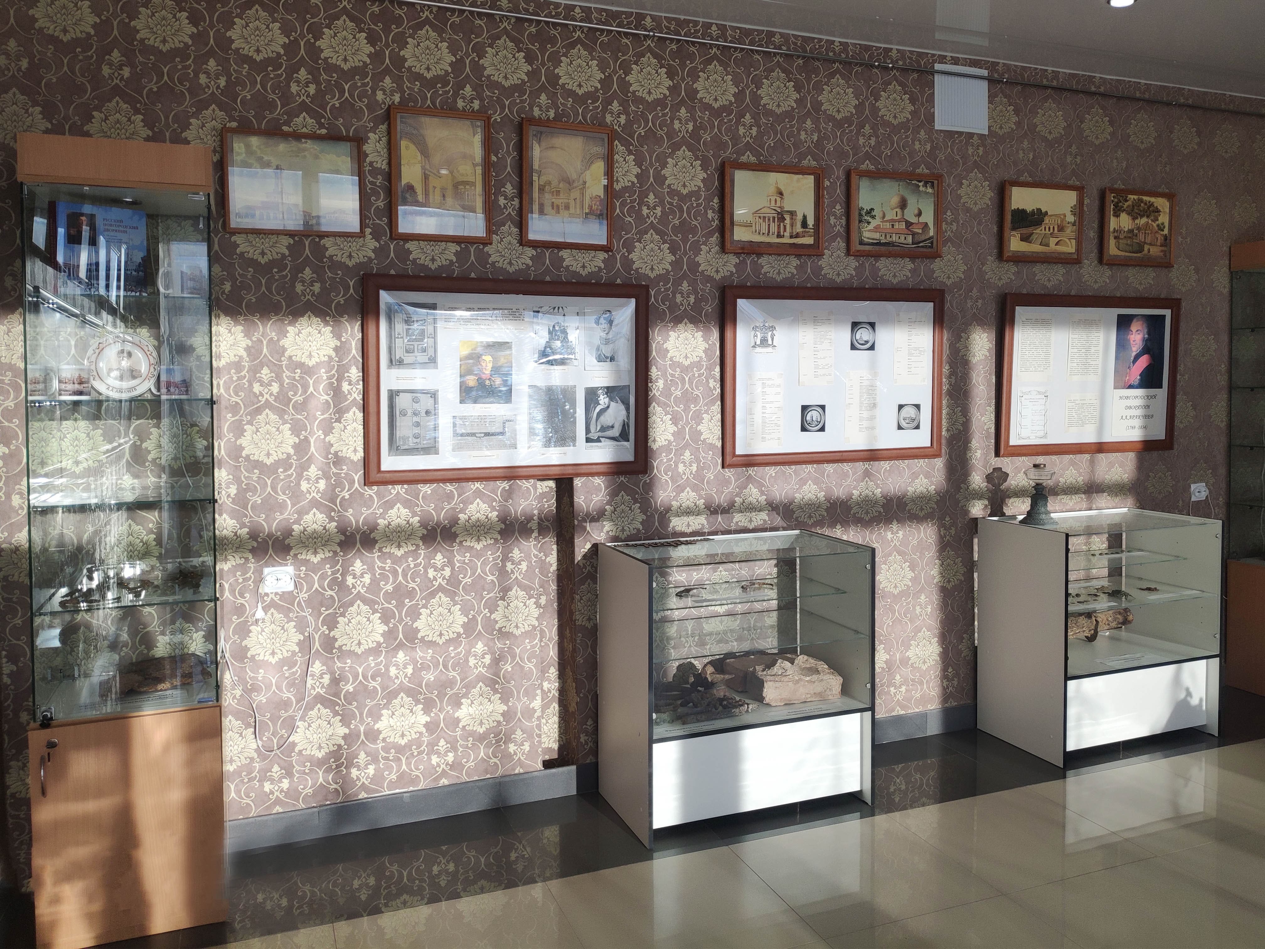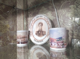 Музейная экспозиция, посвященная графу А.А. Аракчееву в Грузинском центре народного творчества и досуга: памятный знак при входе в центр, вход в музейную комнату, фрагменты экспозиций, исторический генеральный план села Грузина в коридоре центра. Дата съемки: осень 2022 года.