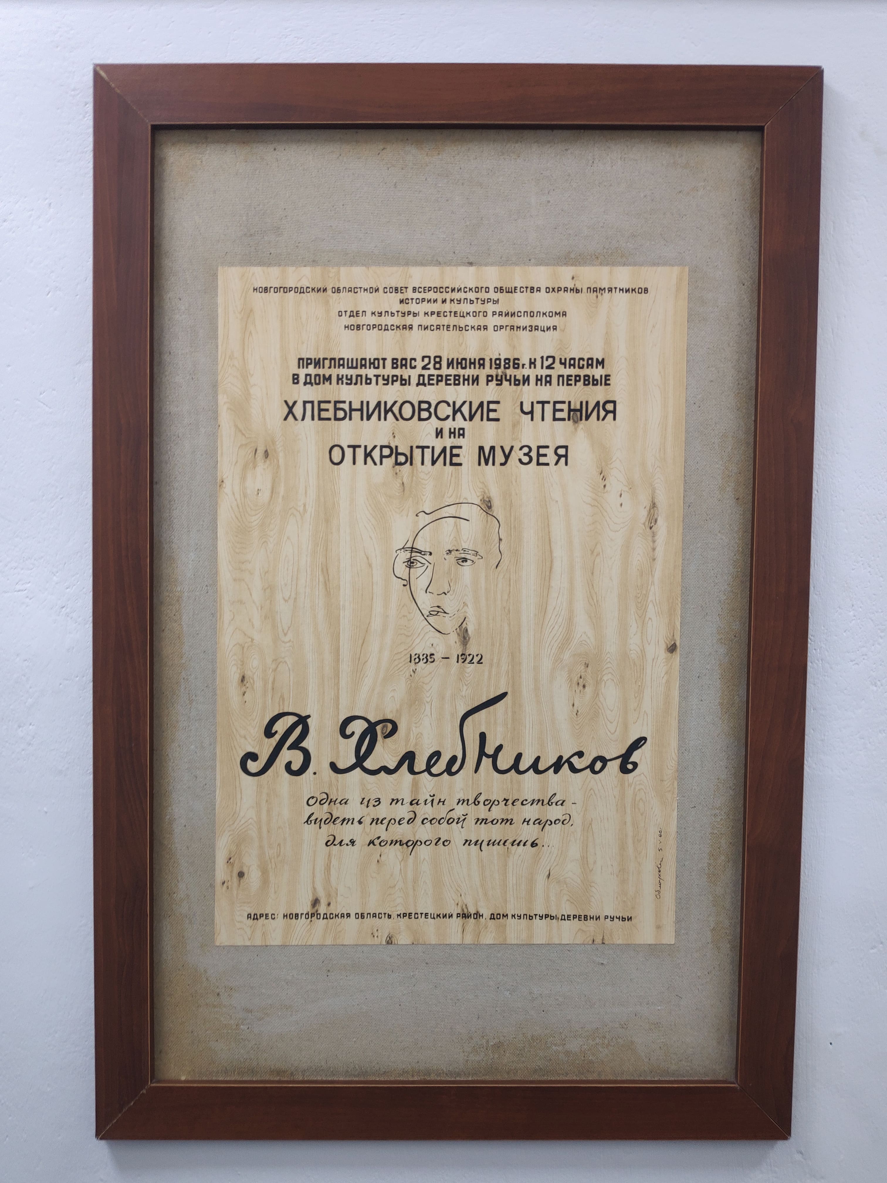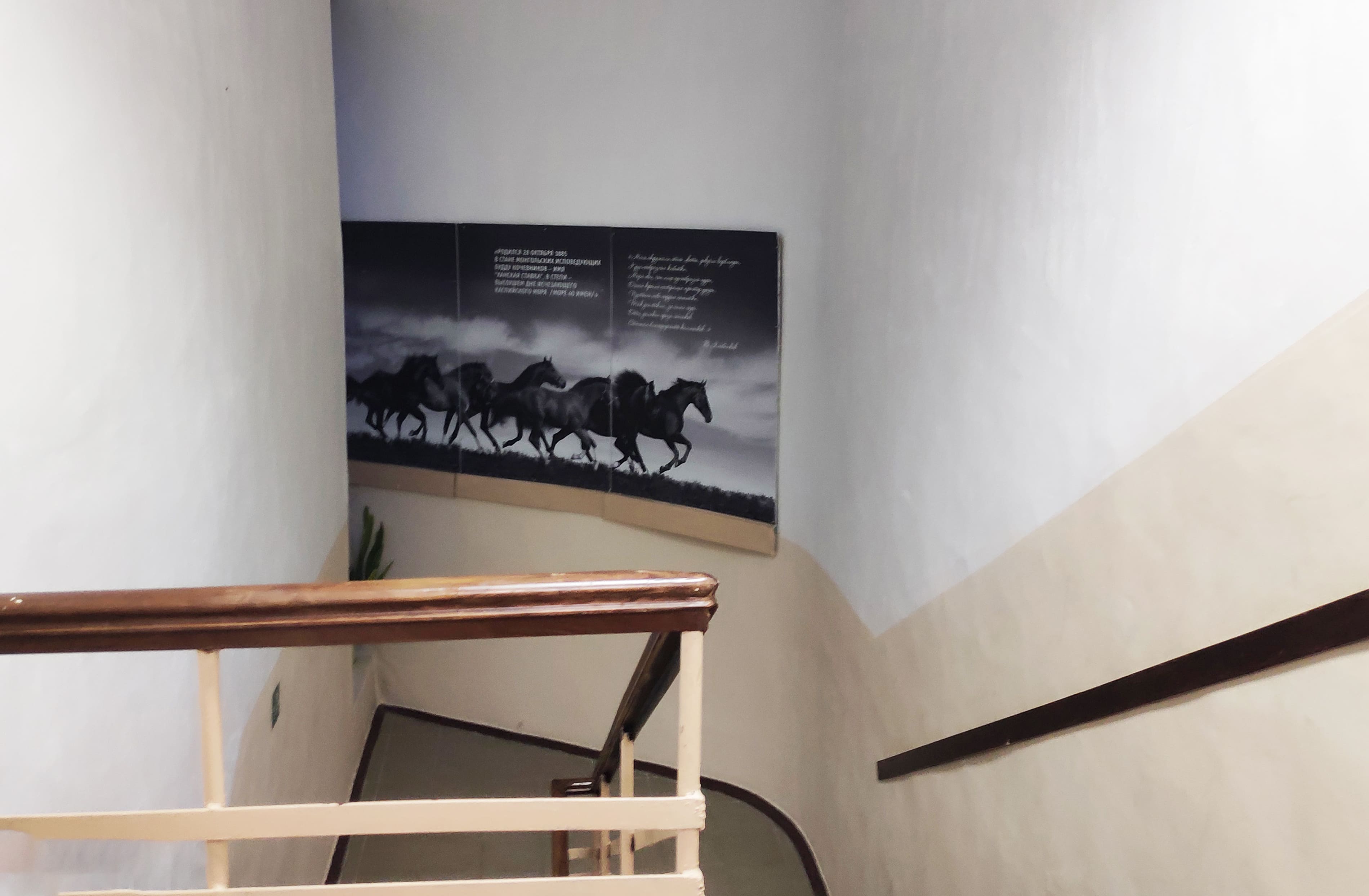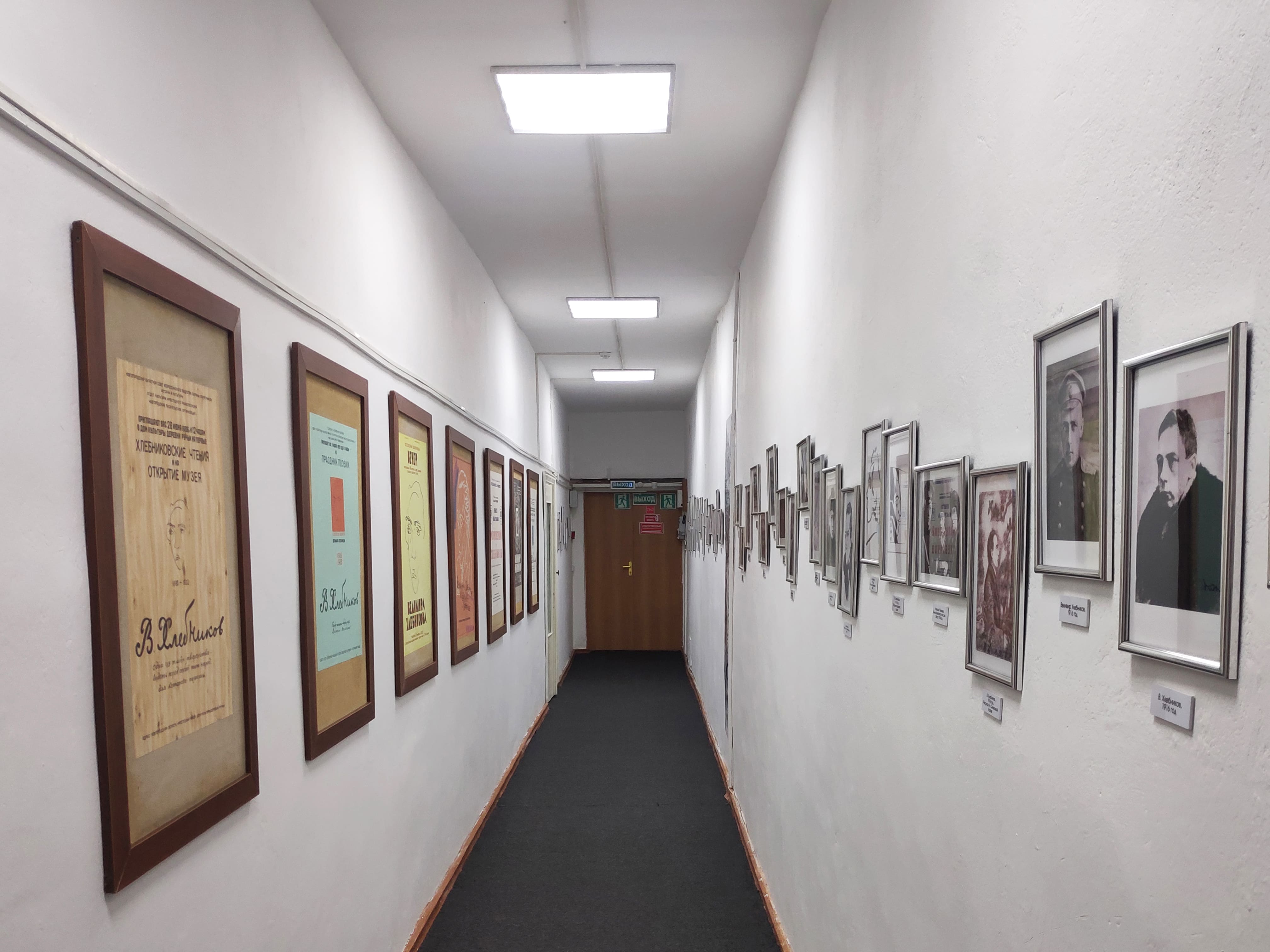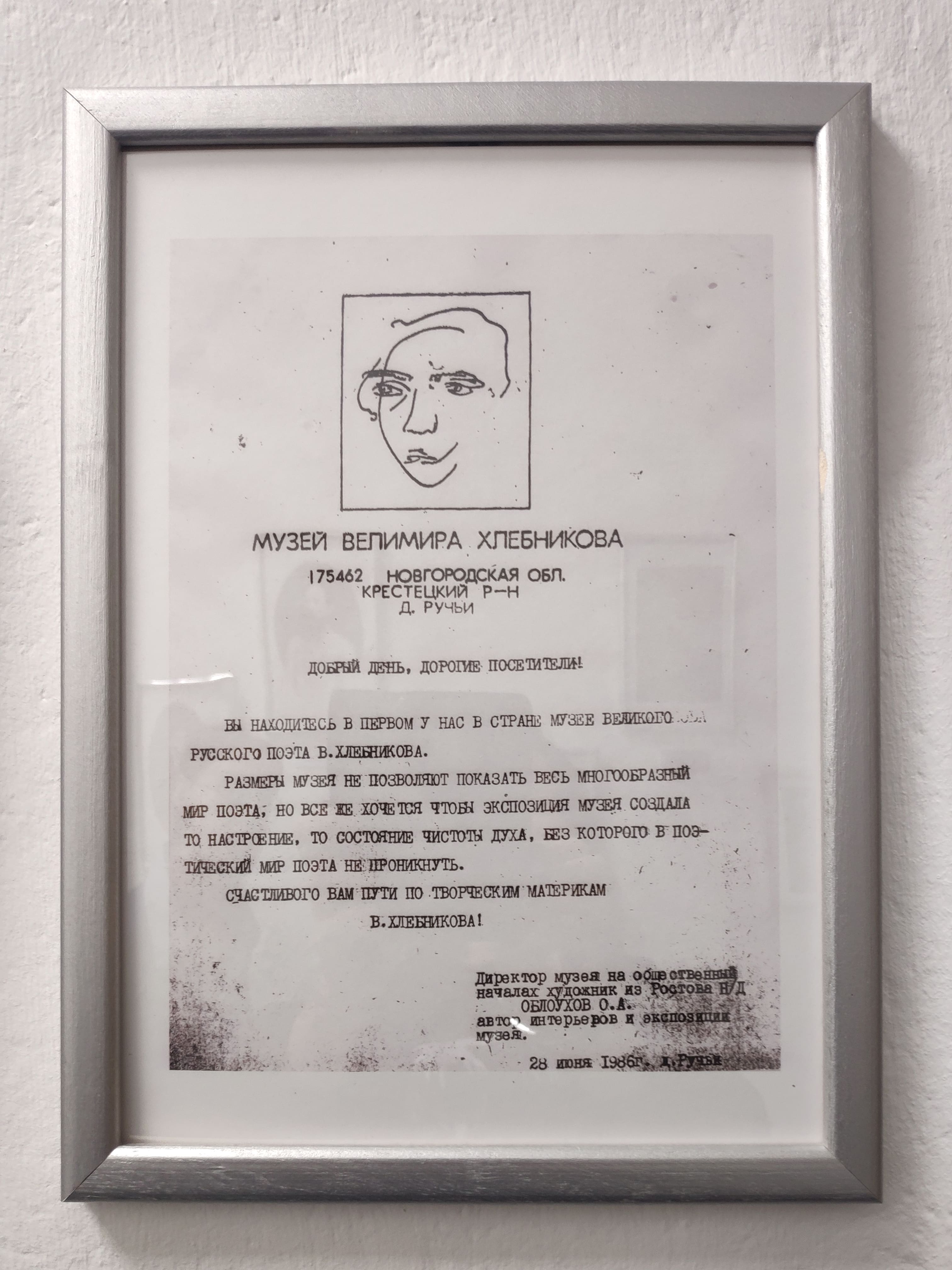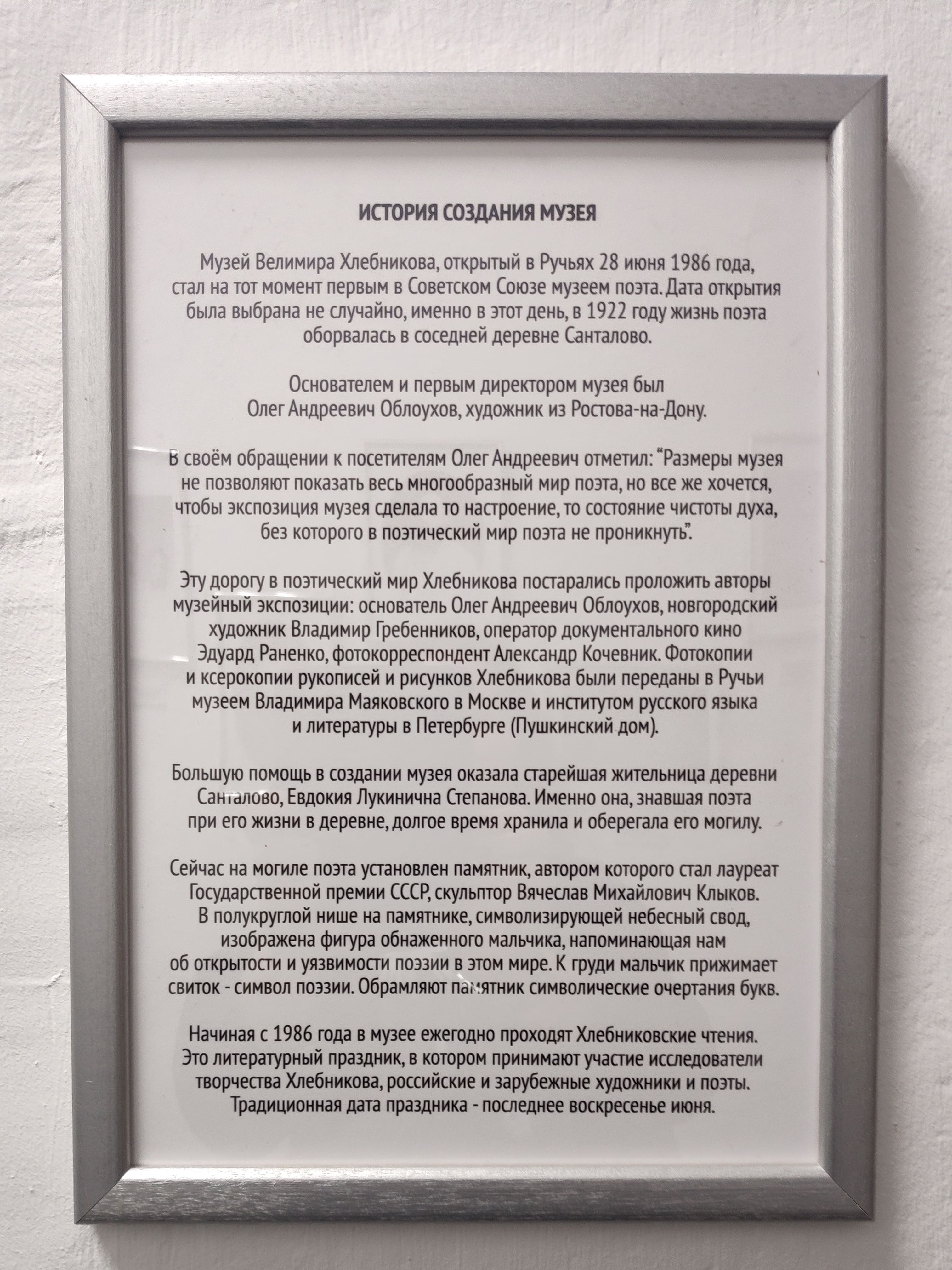 Музей Велимира Хлебникова в Ручьях: мурал на входе, лестница и коридор, выставочные залы. Дата съемки: осень 2022 года.