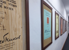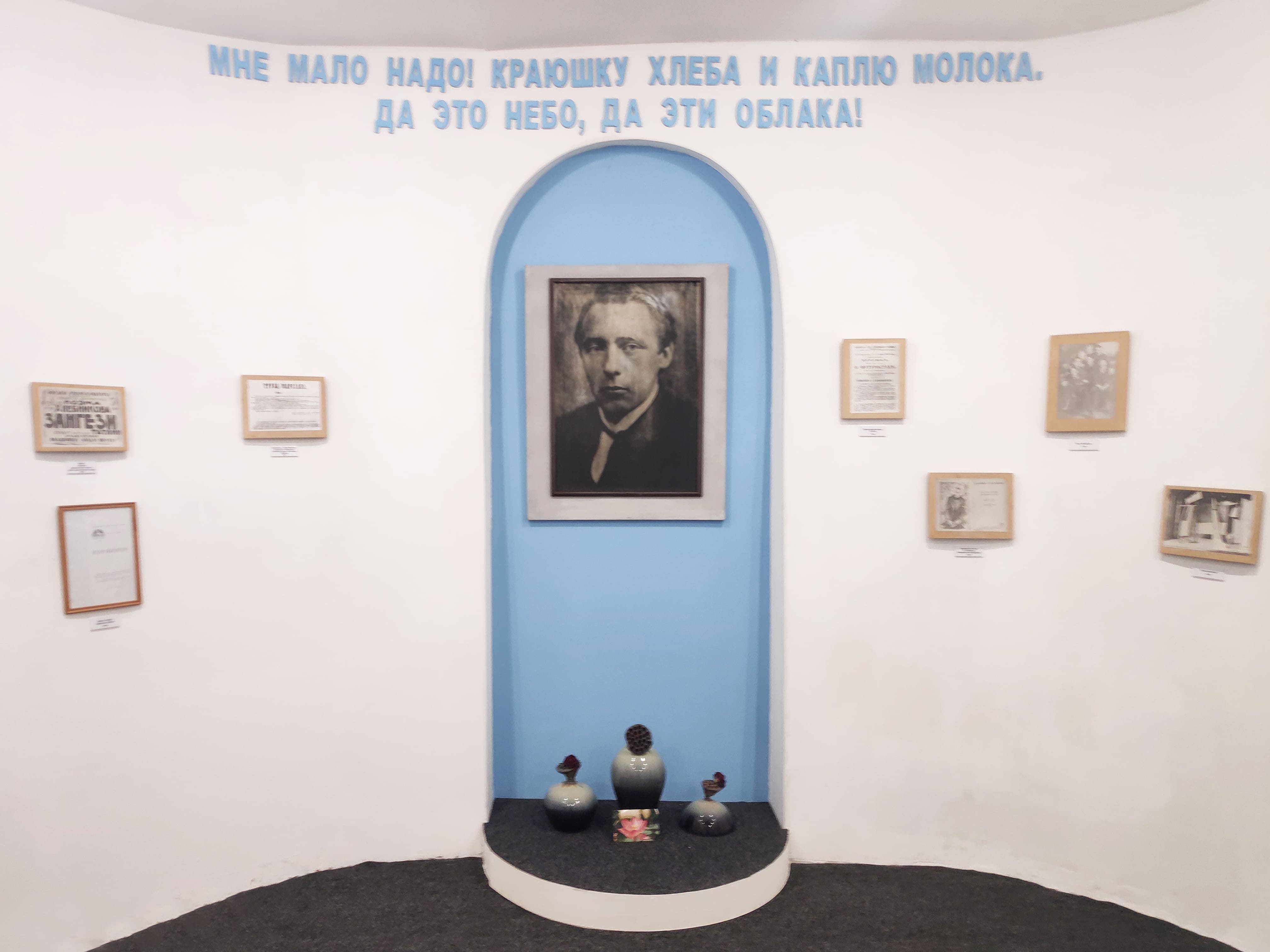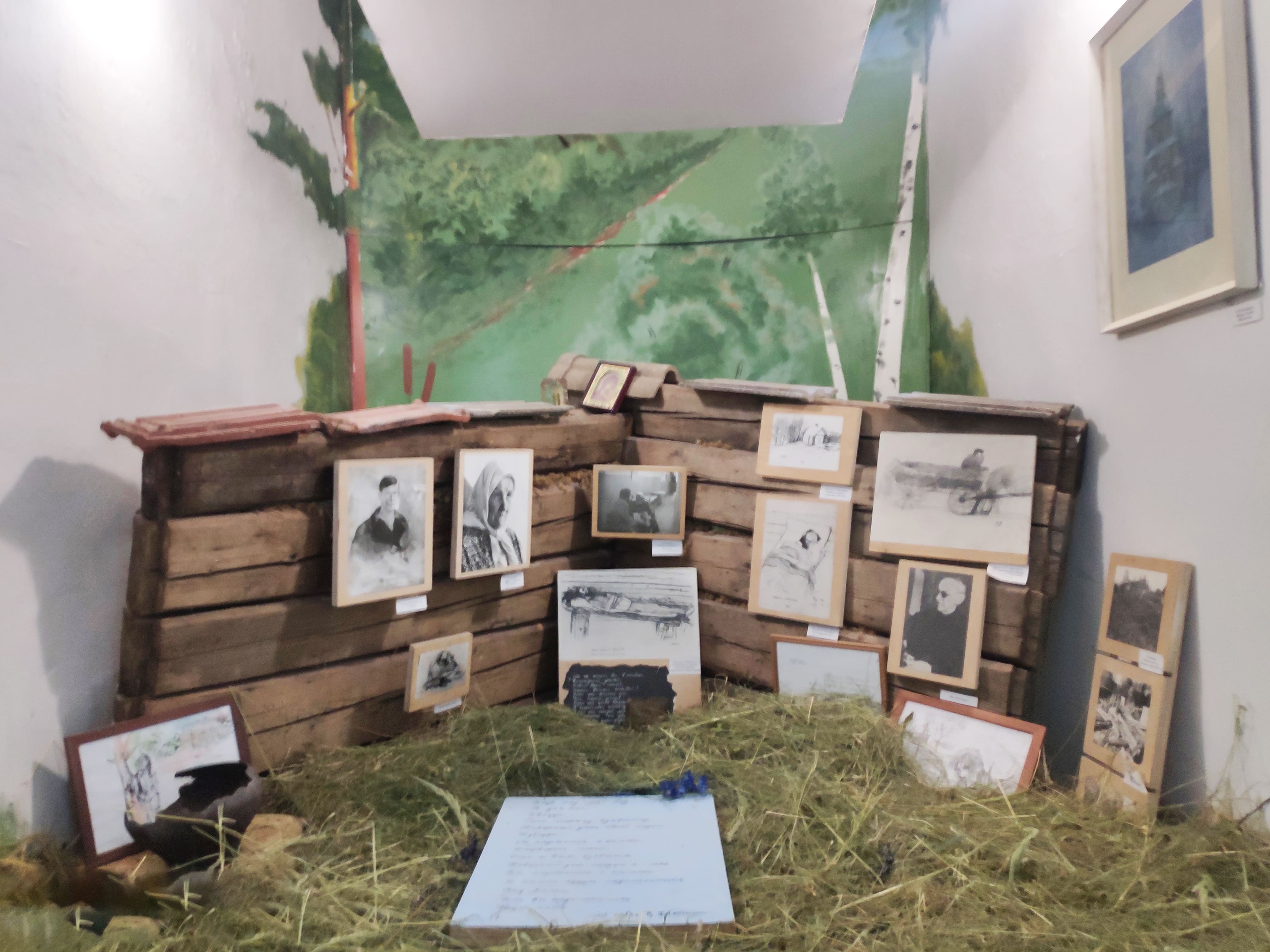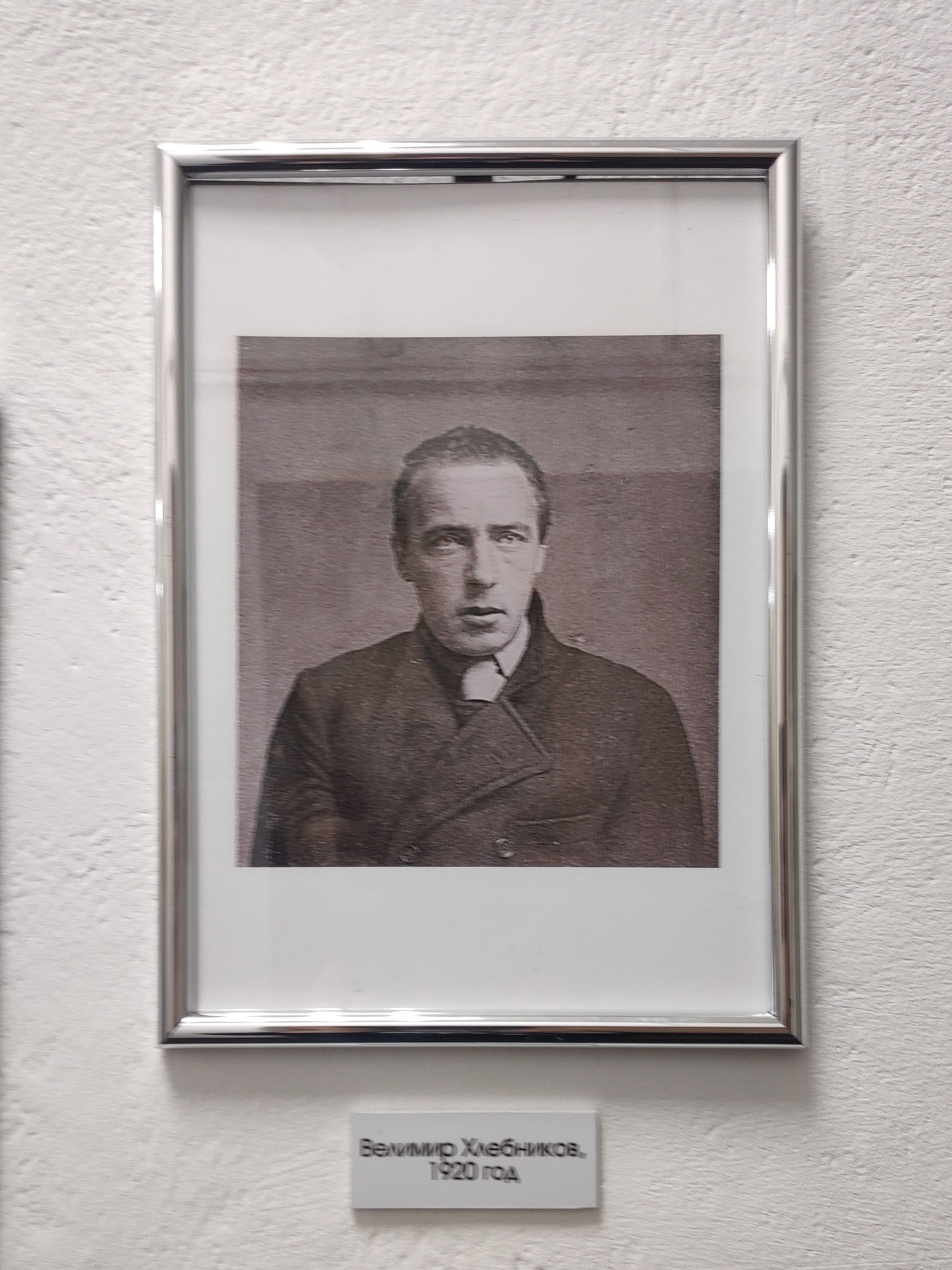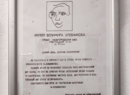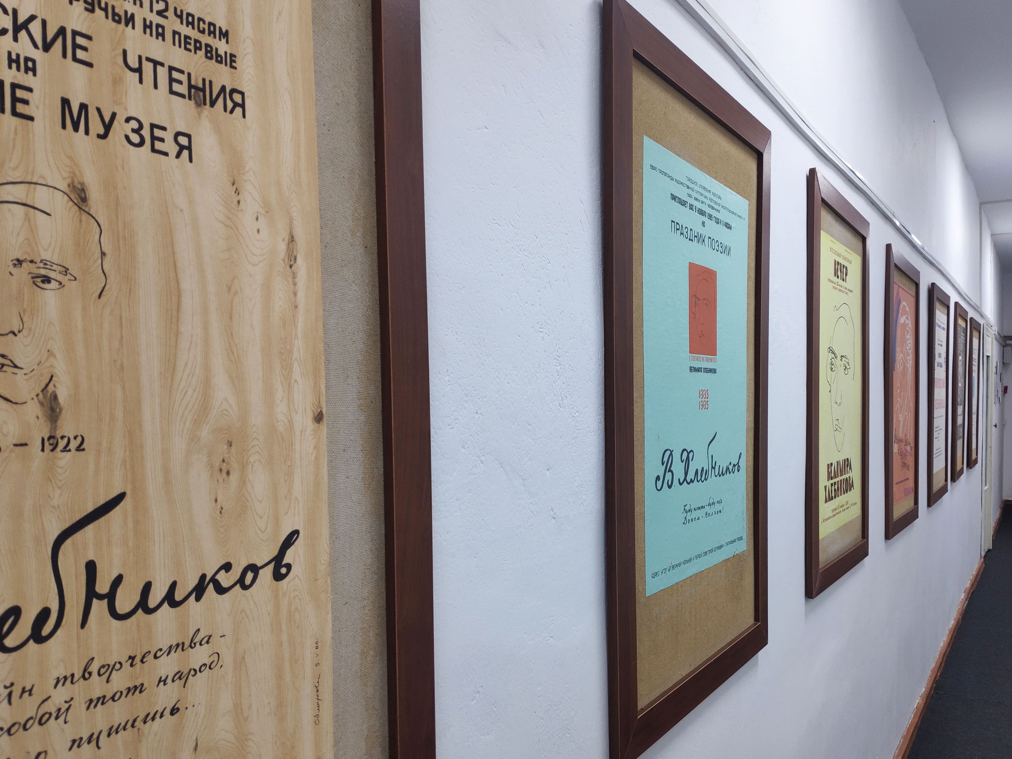 Музей Велимира Хлебникова в Ручьях: мурал на входе, лестница и коридор, выставочные залы. Дата съемки: осень 2022 года.