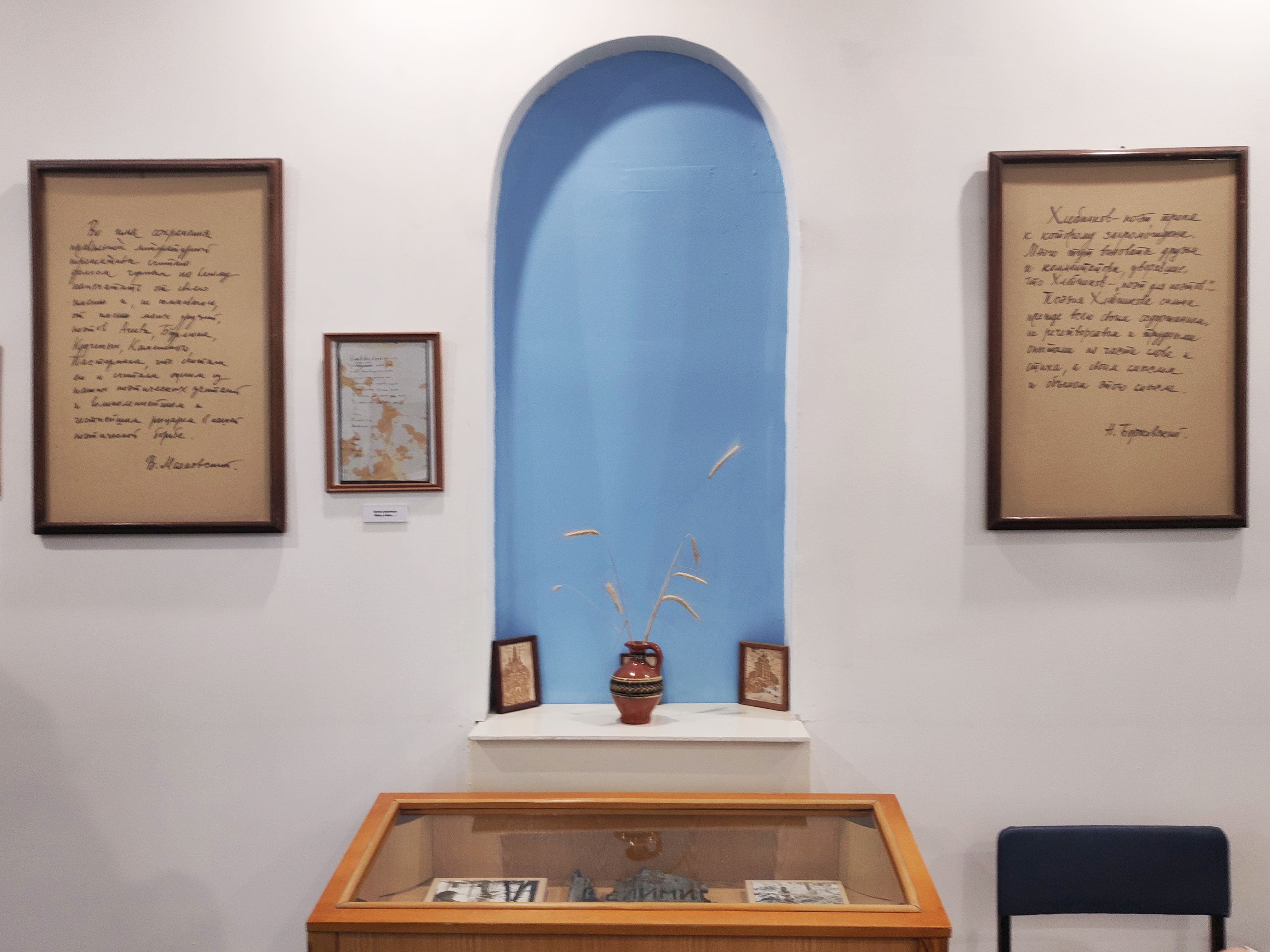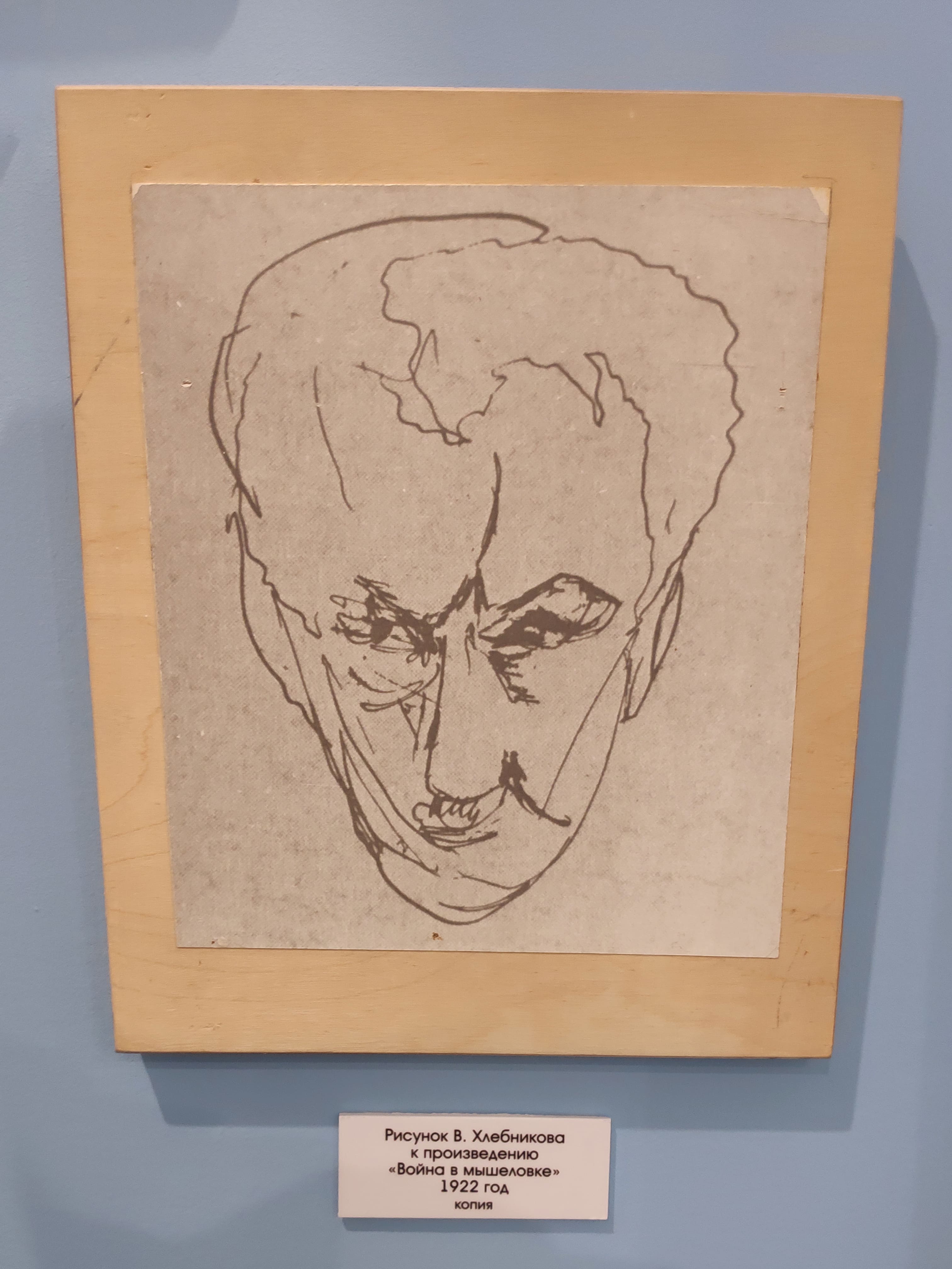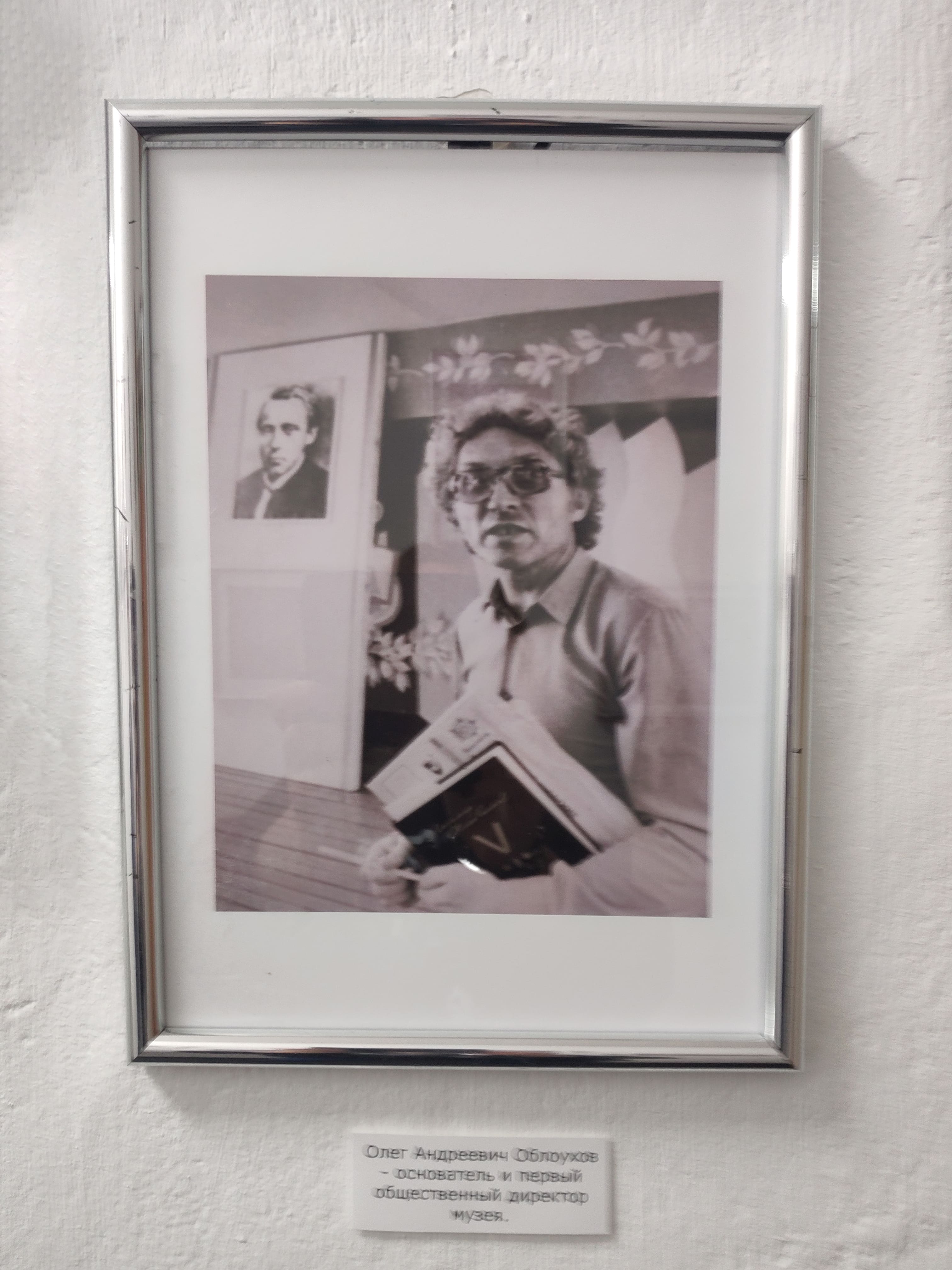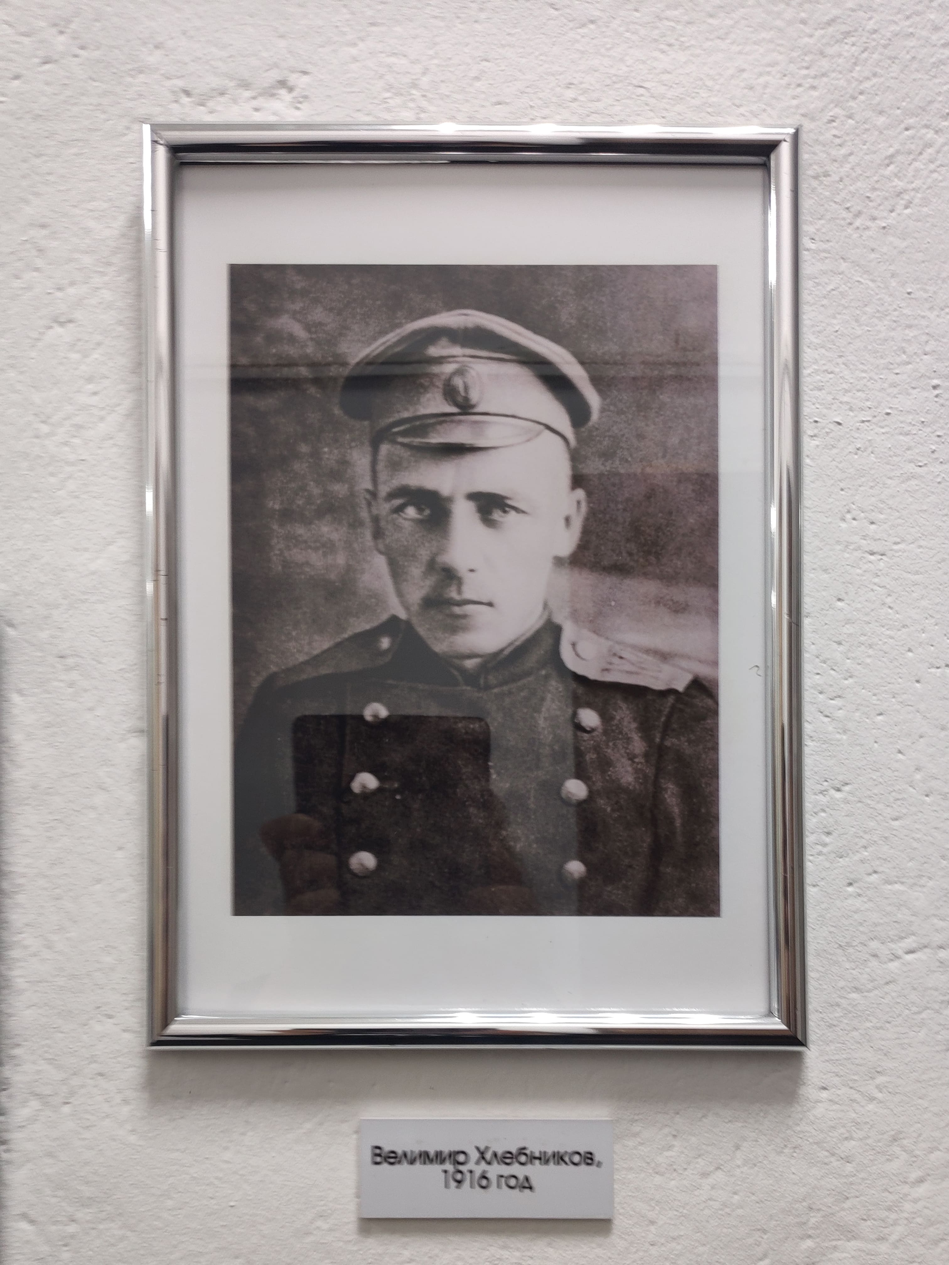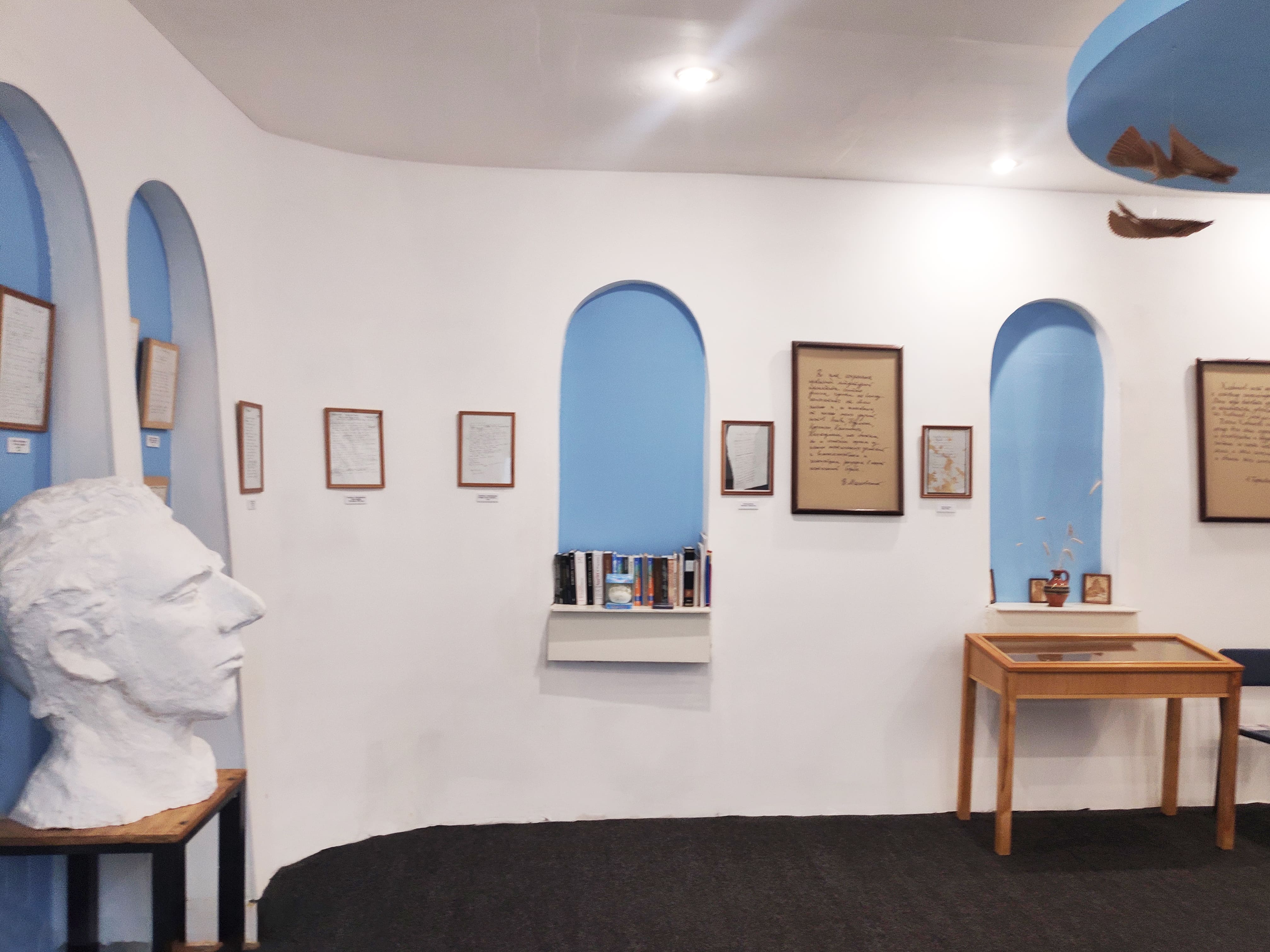 Музей Велимира Хлебникова в Ручьях: мурал на входе, лестница и коридор, выставочные залы. Дата съемки: осень 2022 года.