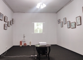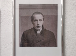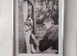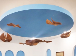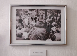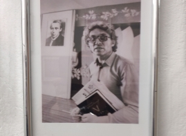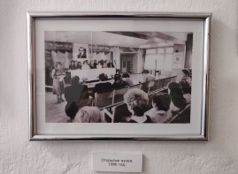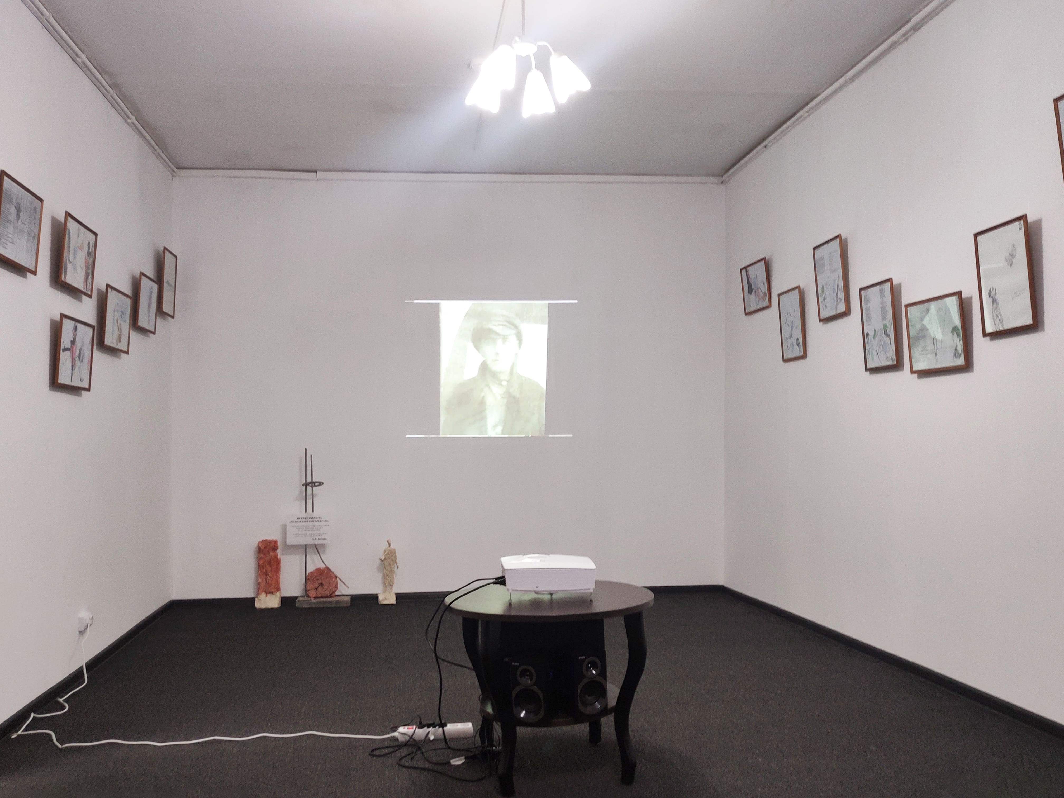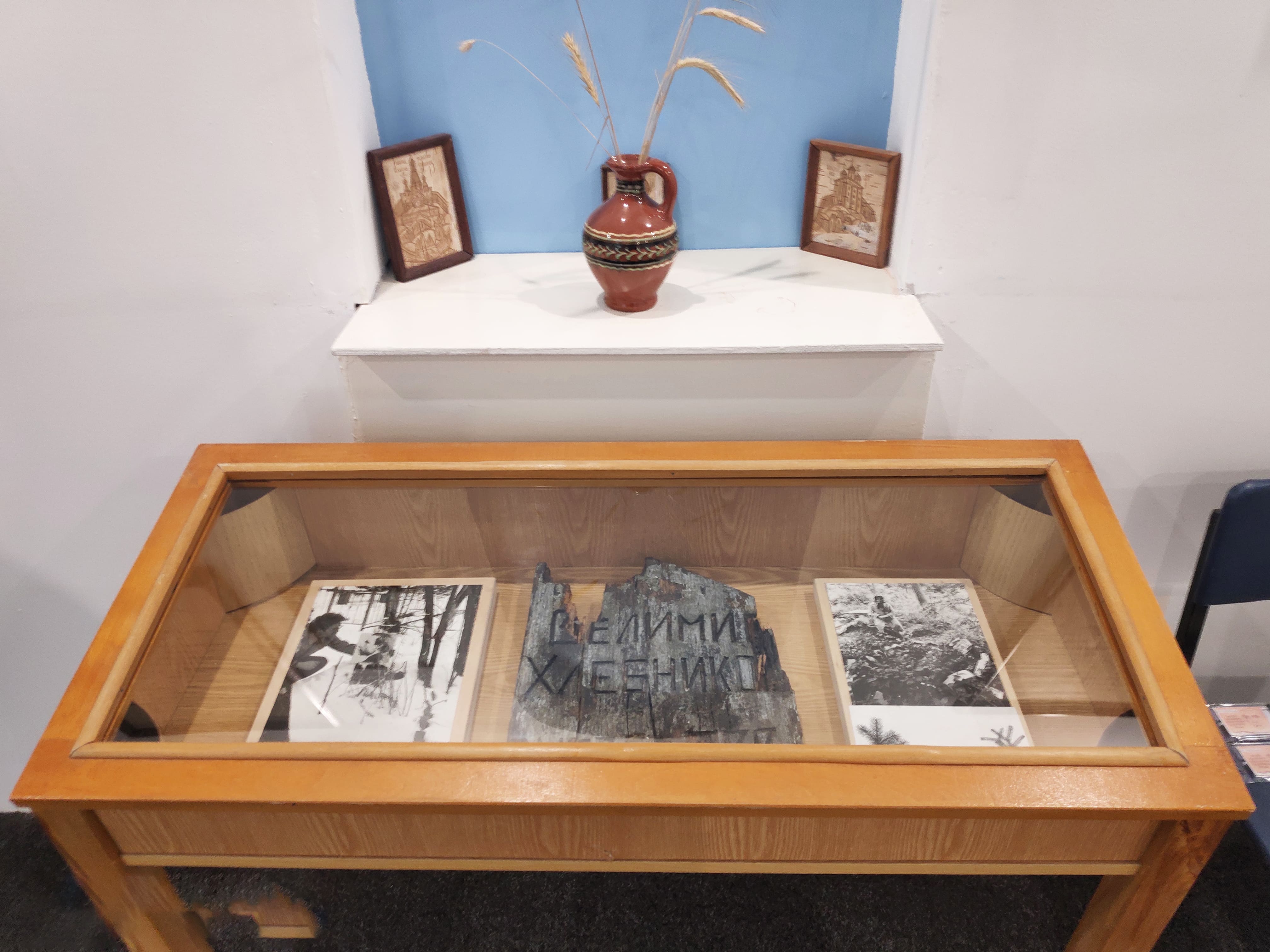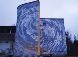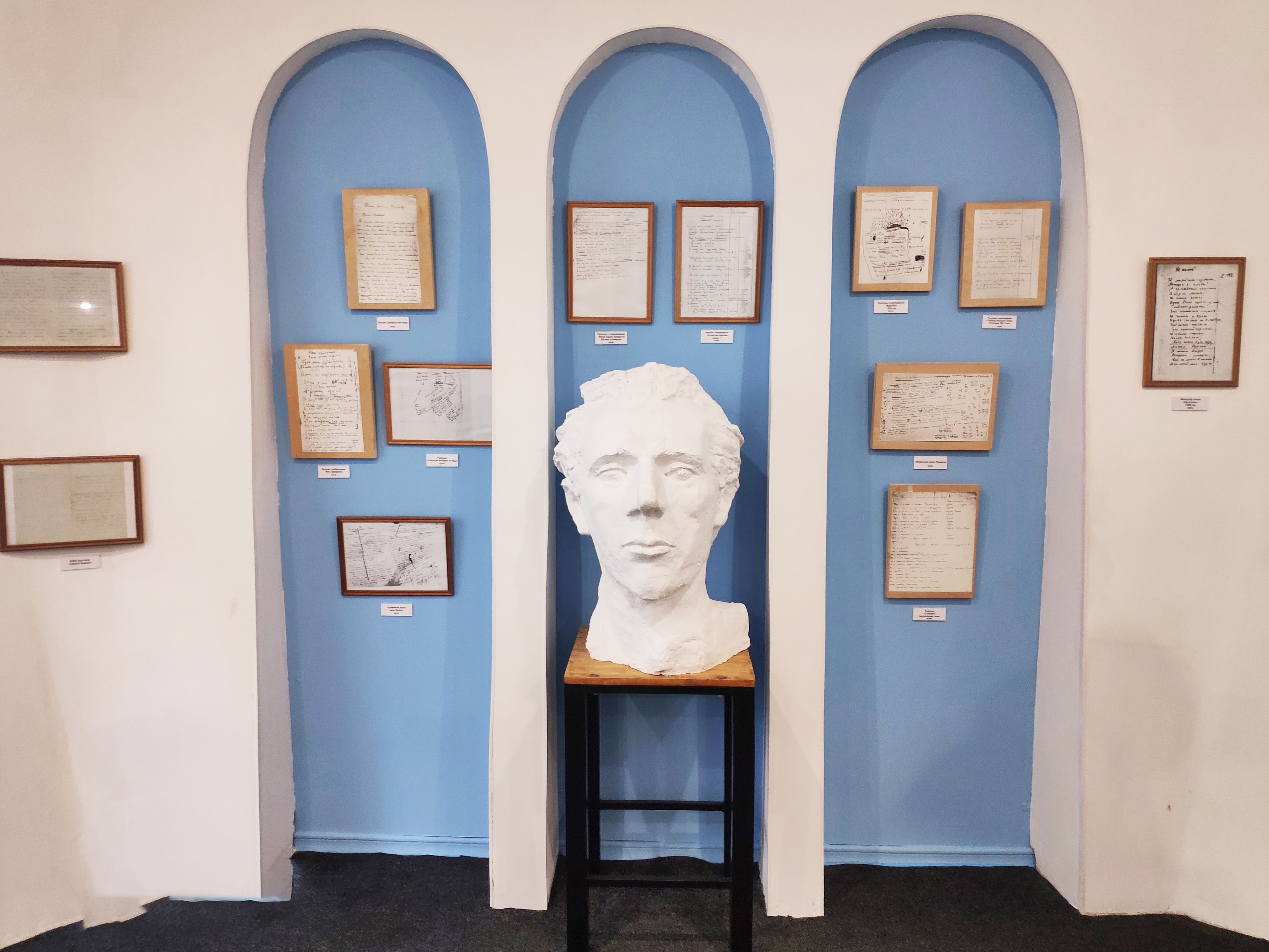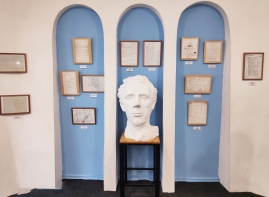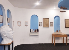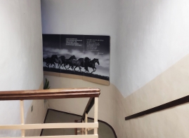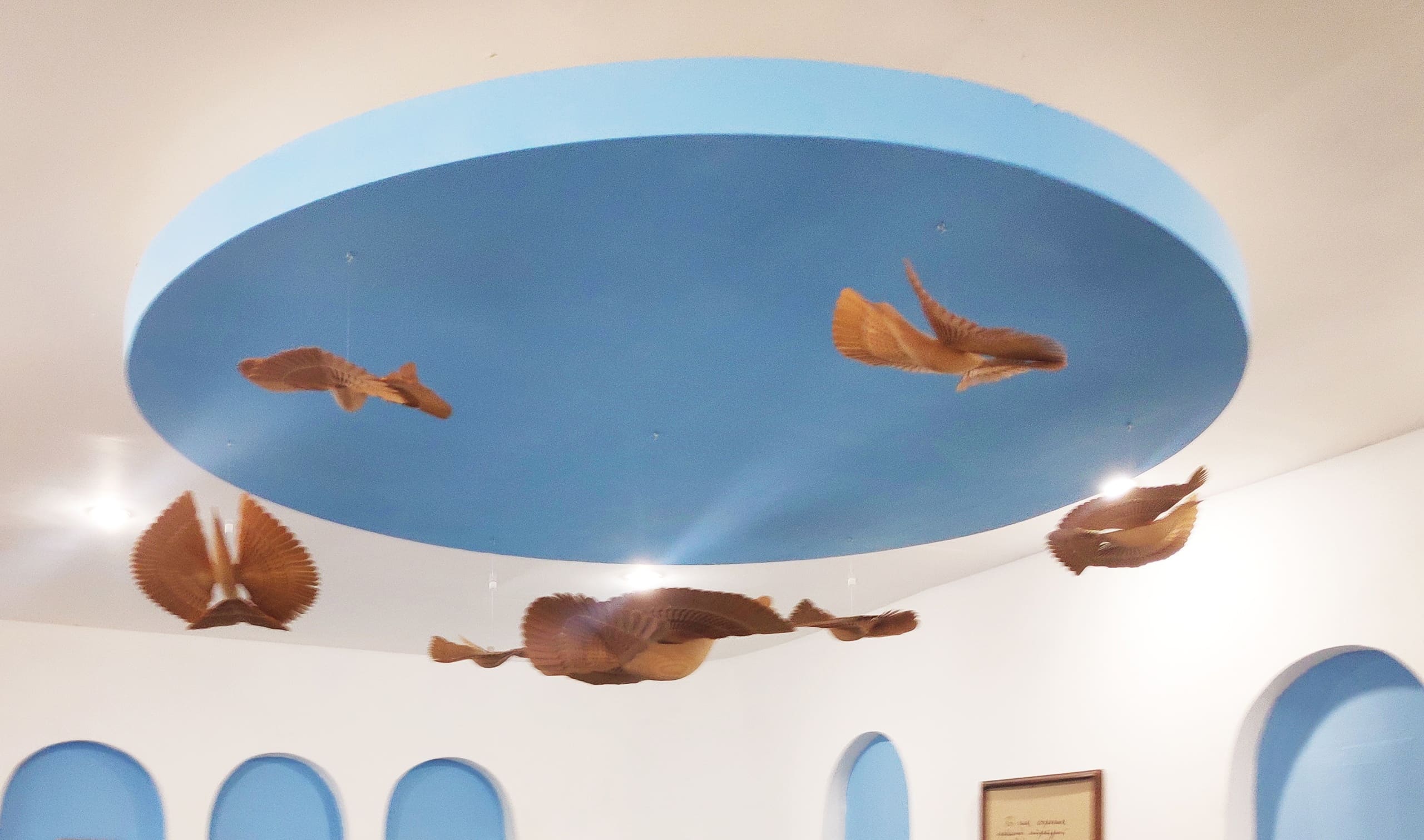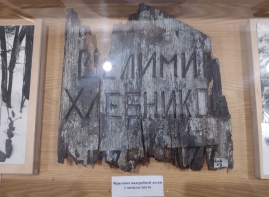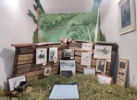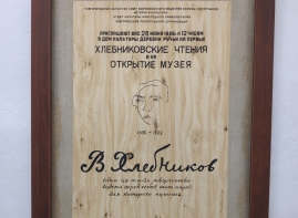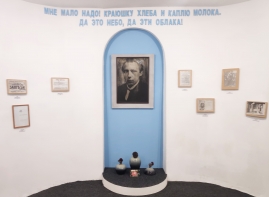 Музей Велимира Хлебникова в Ручьях: мурал на входе, лестница и коридор, выставочные залы. Дата съемки: осень 2022 года.